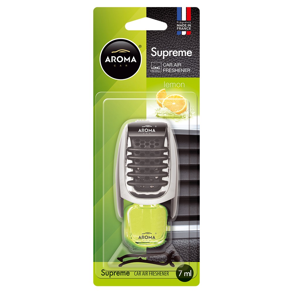Класичний продукт отримав визнання у багатьох автолюбителів Aroma Car Supreme - Lemon 7 мл (830627). Цей ароматизатор поєднує в собі ефект повільного і тривалого випаровування та інтенсивність аромату. Це водночас елегантно і функціонально. Його можна встановити на горизонтальних або вертикальних решітках вентиляційних отворів системи обдуву автомобіля.