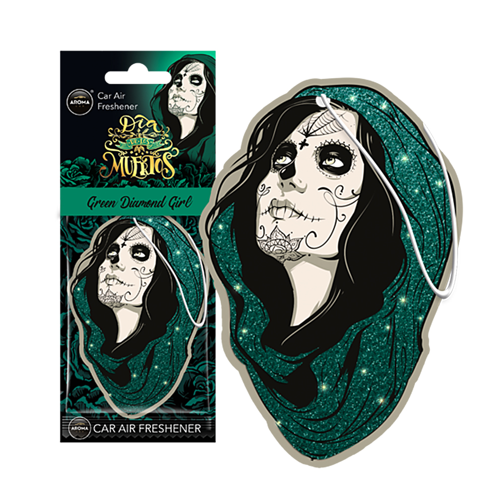 Автомобільний ароматизатор Aroma Car Dia De Los Muertos - Green Diamond Girl (83279) — освіжувач повітря із спеціального целюлозного картону у вигляді підвіски, просоченого рідким ароматизатором. Зазвичай, цей тип ароматизаторів підвішують на дзеркало заднього виду в салоні автомобіля.