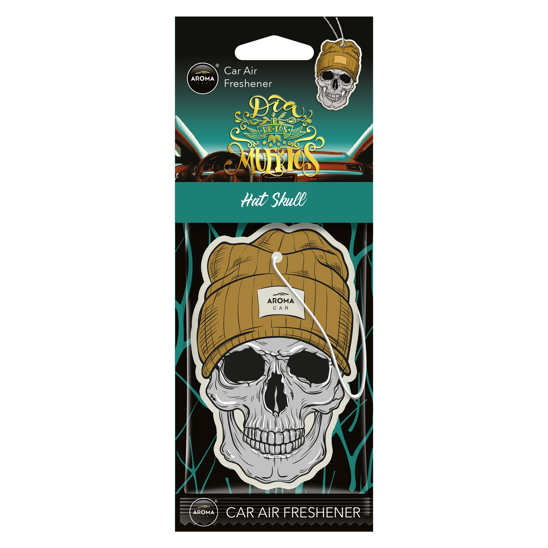Автомобільний ароматизатор Aroma Car Dia De Los Muertos - Hat Skull (83278) — освіжувач повітря із спеціального целюлозного картону у вигляді підвіски, просоченого рідким ароматизатором. Зазвичай, цей тип ароматизаторів підвішують на дзеркало заднього виду в салоні автомобіля.