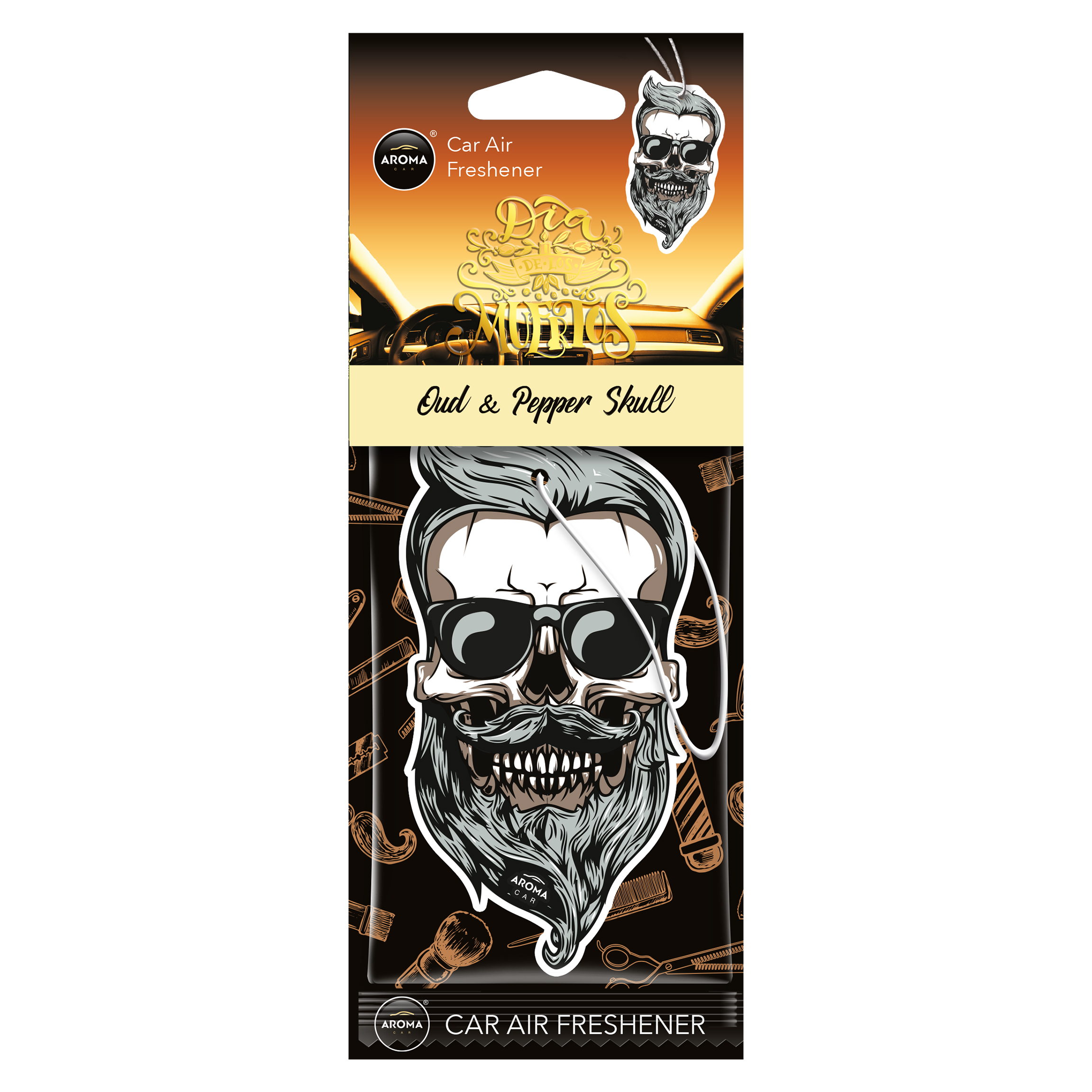 Автомобільний ароматизатор Aroma Car Dia De Los Muertos - Oud & Pepper Skull (83120) — освіжувач повітря із спеціального целюлозного картону у вигляді підвіски, просоченого рідким ароматизатором. Зазвичай, цей тип ароматизаторів підвішують на дзеркало заднього виду в салоні автомобіля.