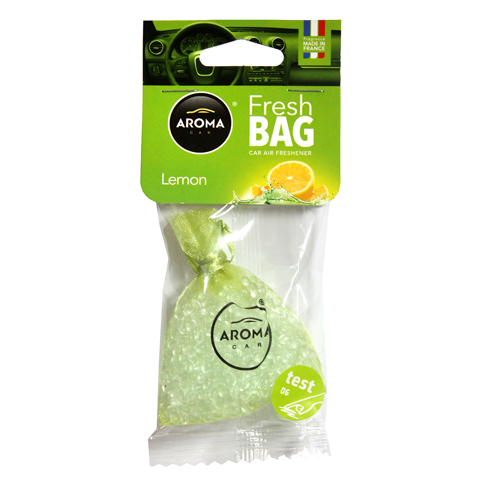 Сучасний полімерний ароматизатор повітря Aroma Car із серії Fresh Bag є сітчастим мішечком наповненим полімерними гранулами і призначений для підвішування на дзеркало заднього виду. Гранули ароматизатора насичені ароматами на основі французьких парфумів. Ароматизатор має аромат Lemon (Лимон).