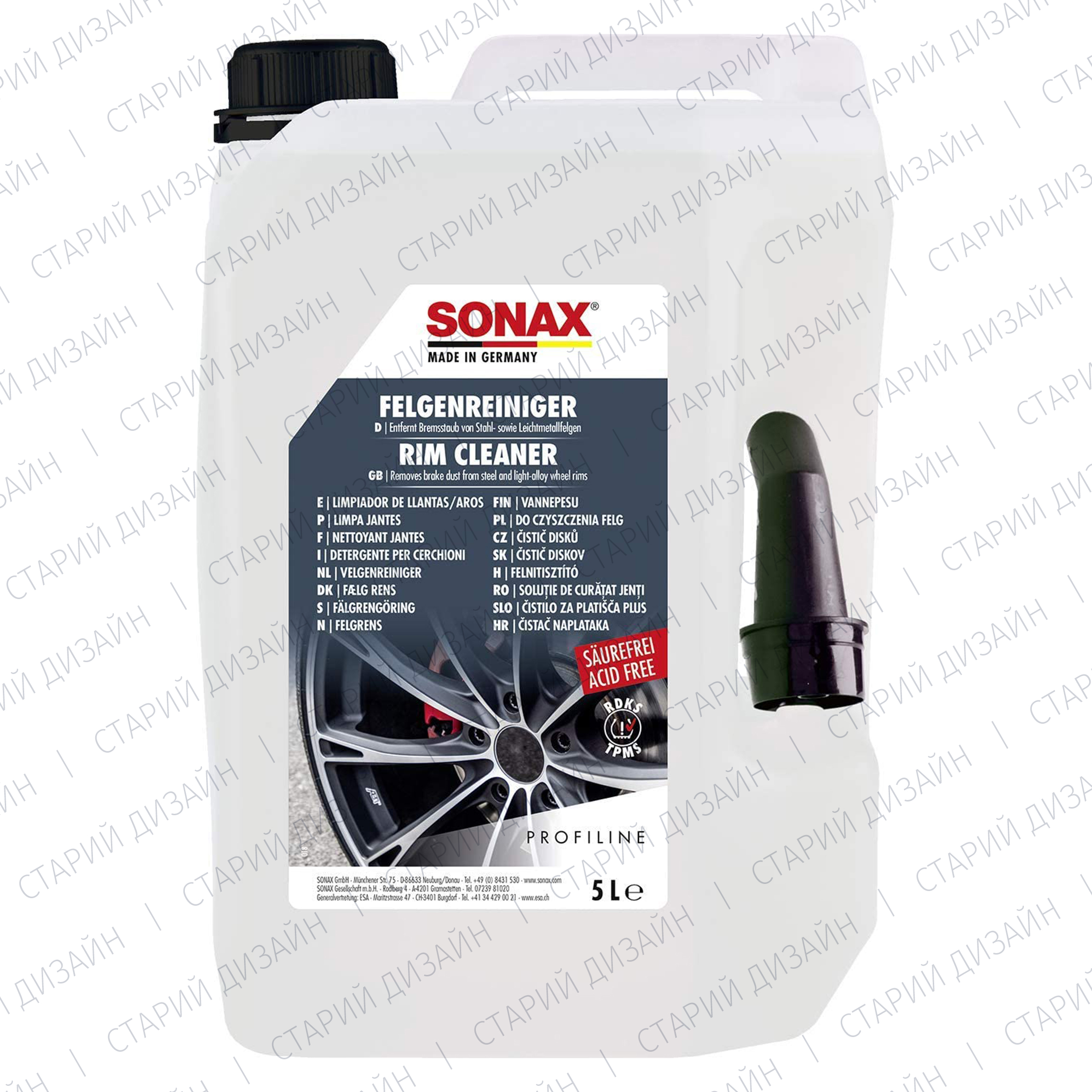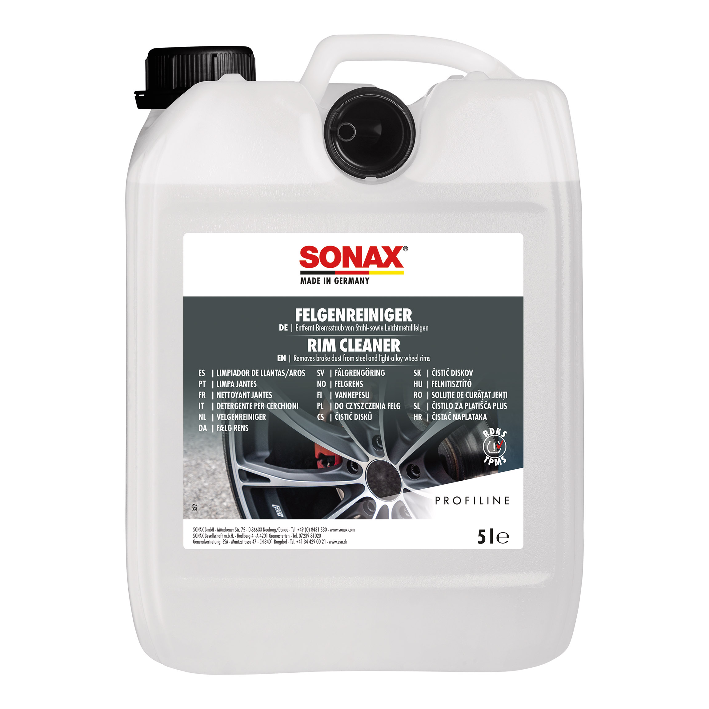 Безкислотний високоефективний очищувач легкосплавних, сталевих дисків SONAX PROFILINE Felgenreiniger säurefrei (230500) . Швидко і легко видаляє навіть найстійкіші забруднення з хромованих і полірованих дисків. Завдяки максимальному захисту поверхні, диски зберігають свій первісний вигляд тривалий час. Засіб гарантовано не пошкоджує поверхню дисків і колісні болти. Очищувач відрізняється інноваційним індикатором впливу на колісні диски (в процессі взаємодії з брудом під дією реакції відбувається зміна кольору засобу). Засіб можна використовувати для чищення дисків з системою TPMS (tire pressure control system — система контролю тиску в шинах).