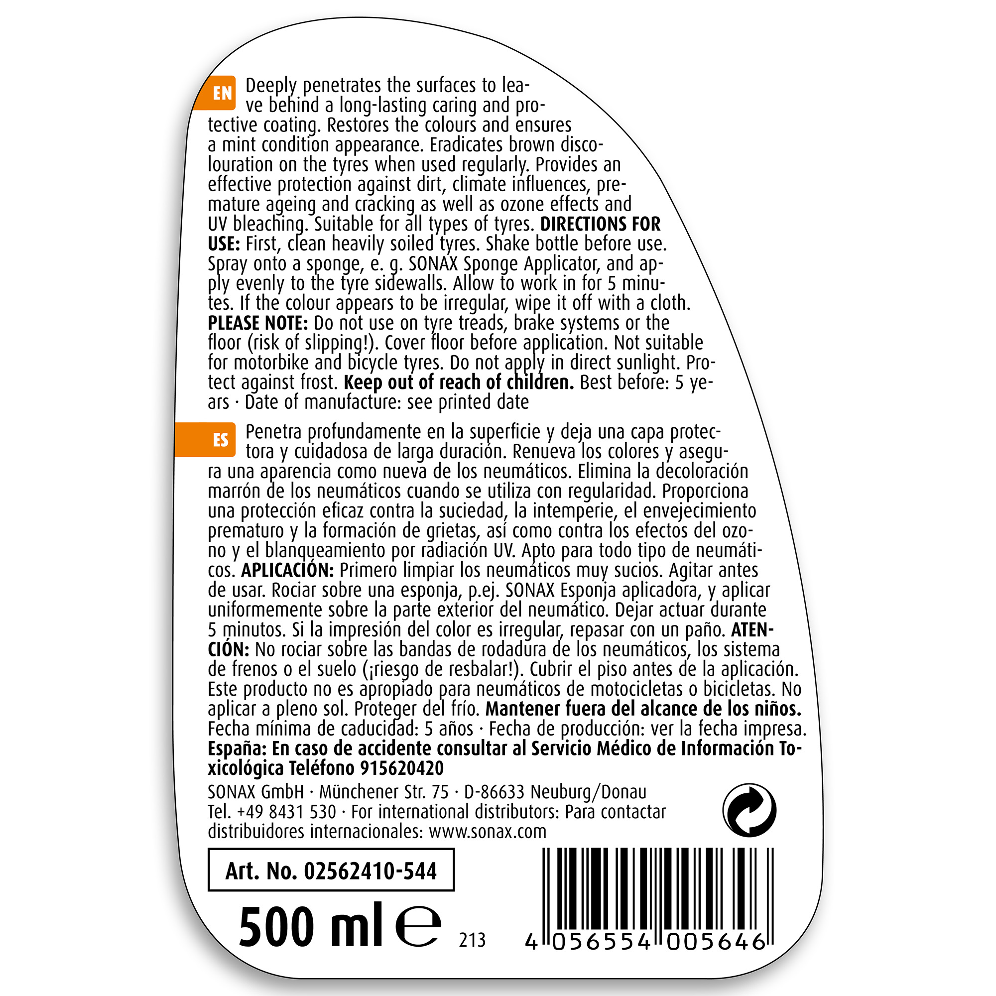Матовий засіб по догляду та чорнінню шин SONAX XTREME Reifen Pfleger Matteffect (256241) надає шинам будь-якого типу ідеальний шовковисто-матовий чорний вигляд. Освіжає колір і надає йому вигляд нової шини. При регулярному використанні видаляє плями на шинах. Забезпечує ефективний захист від бруду, погодних впливів, передчасного старіння та розтріскування, а також від впливу озону та вицвітання через УФ-промені. Підходить для всіх типів автомобільних шин.