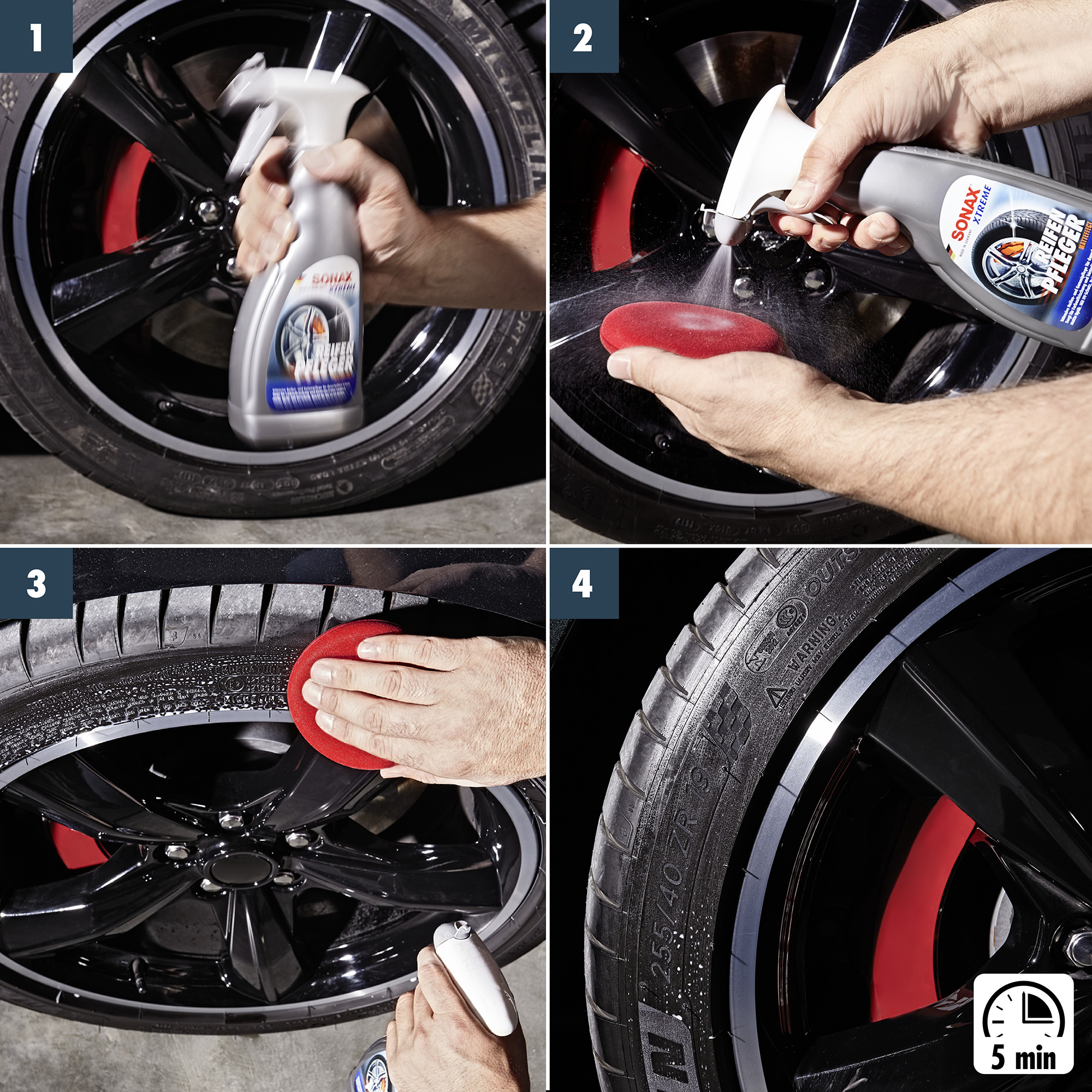 - Розпиліть засіб SONAX XTREME ReifenPfleger Matteffect (256241) на губку, (наприклад, на губку-аплікатор SONAX Super Soft 417641) і рівномірно розподіліть на зовнішній поверхні шини.
