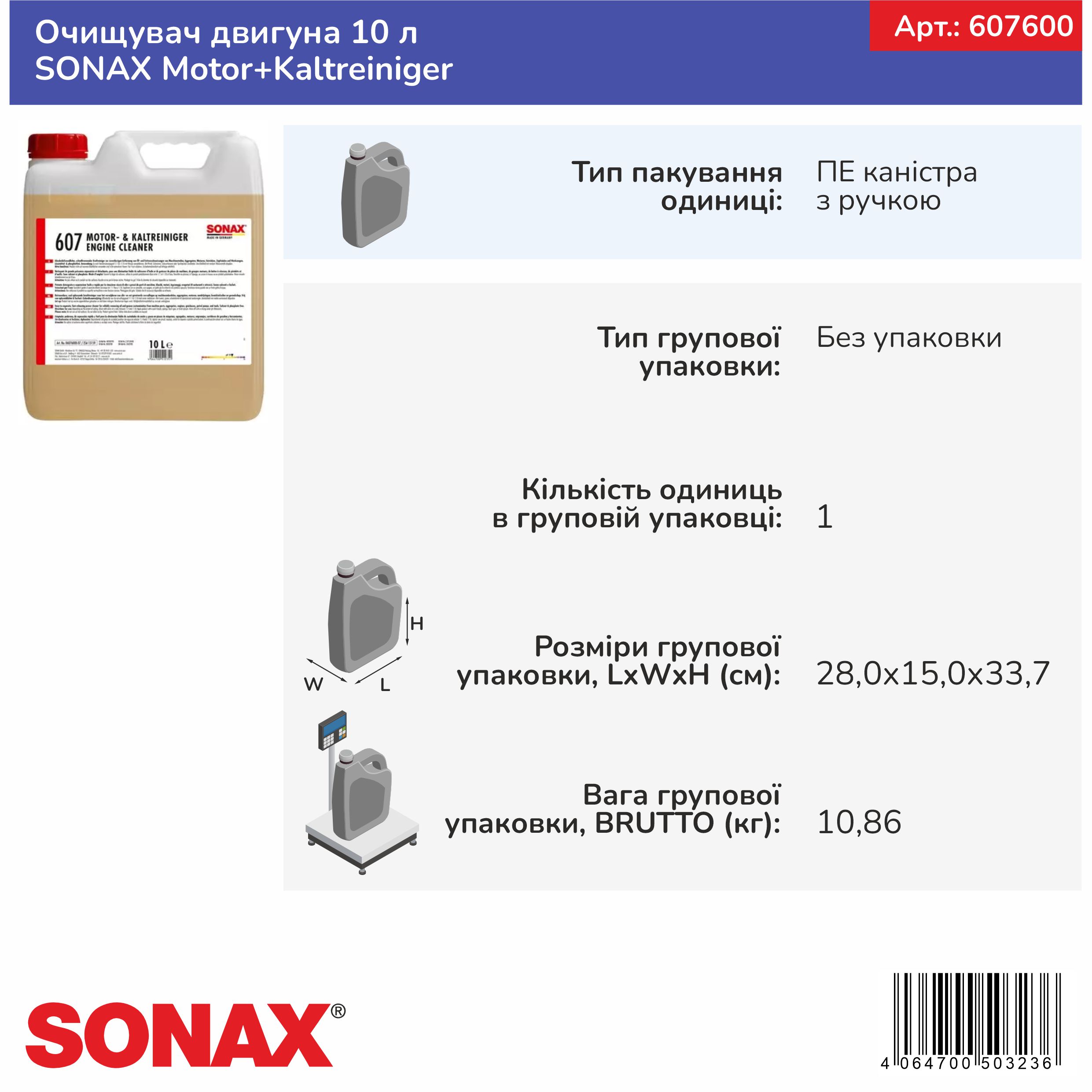Очищувач двигуна 10 л SONAX Motor+Kaltreiniger (607600)