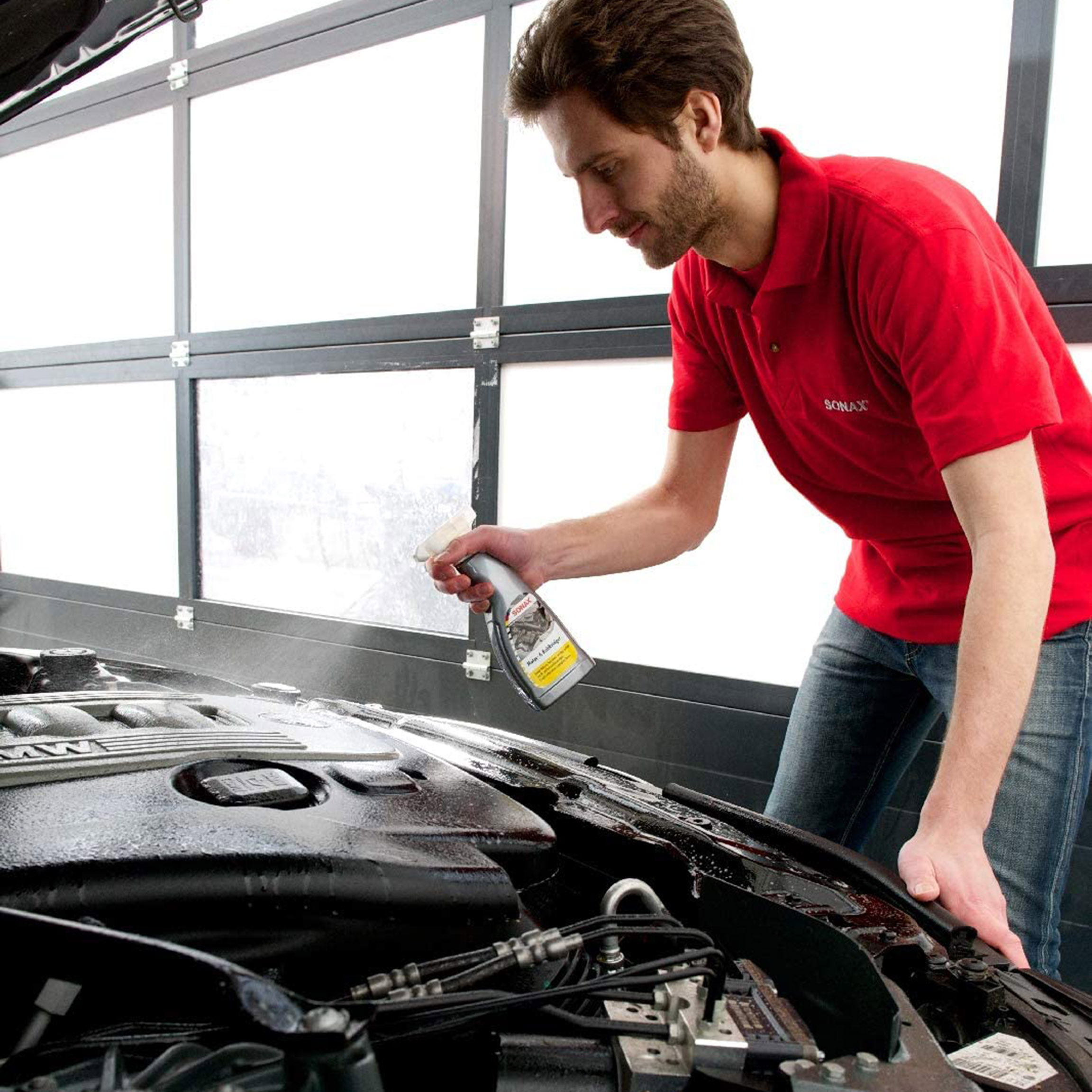 - Розпиліть засіб на холодний двигун і при необхідності протріть щіткою, потім змийте сильним струменем води.