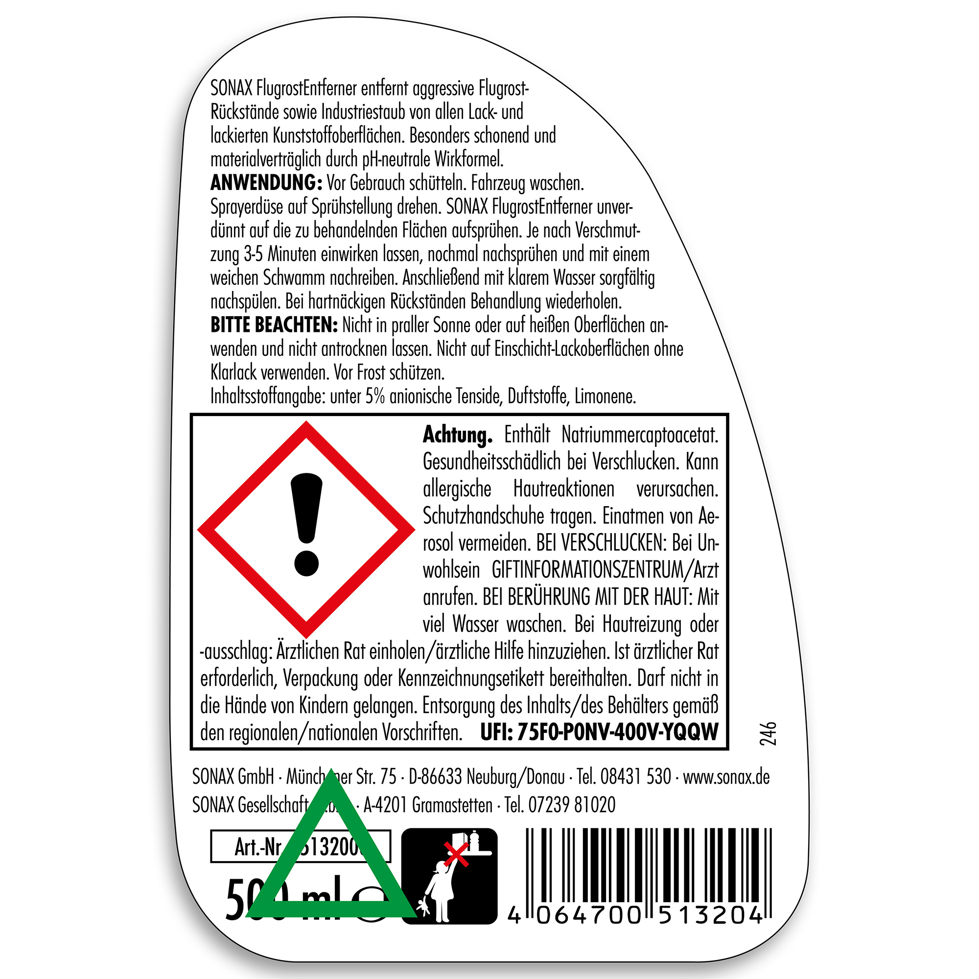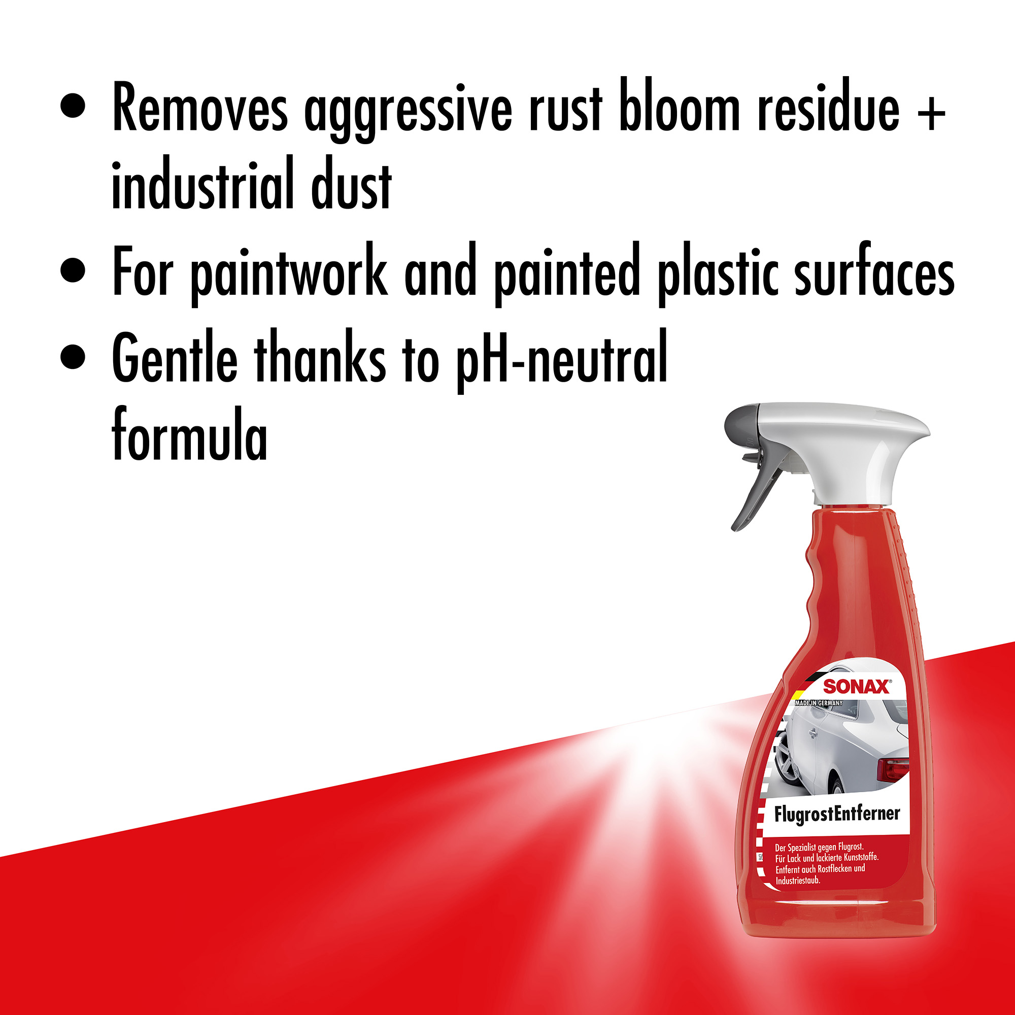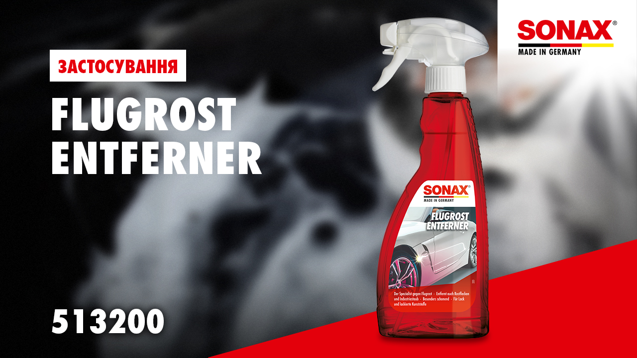 Засіб для ефективного видалення агресивної іржі SONAX Flash Rust Remover (513200) з поверхні кузова автомобіля в місцях сколів, подряпин і інших пошкоджень лакофарбового покриття, в результаті яких незахищений метал почав іржавіти. Завдяки  активній формулі засіб з нейтральним рН дозволяє дбайливо взаємодяти з лакофарбовим покриттям.