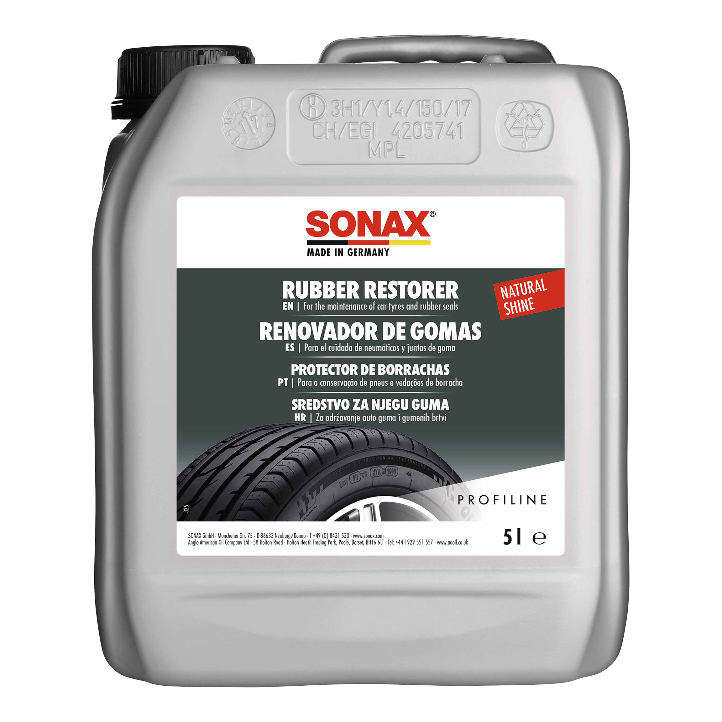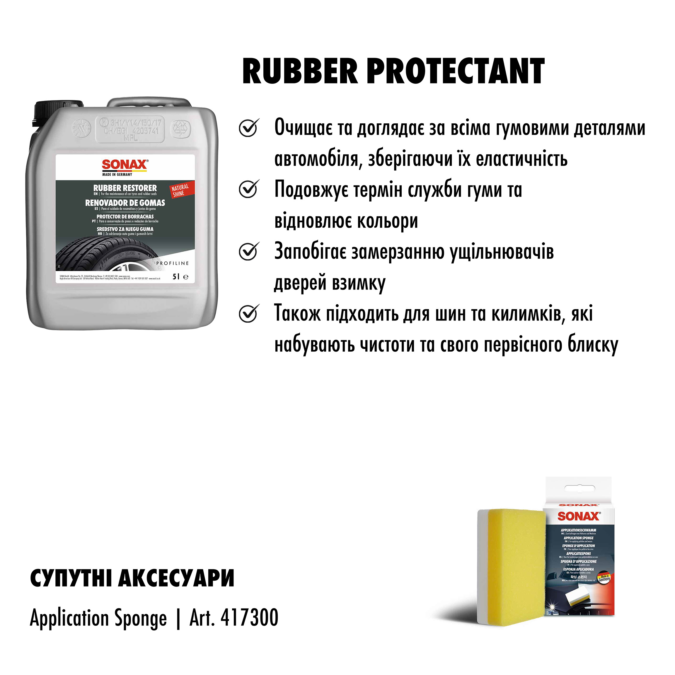 Силіконовий засіб для чищення та догляду за гумою SONAX PROFILINE Rubber Restorer (340505). Завдяки обробці цим засобом гумові елементи зберігають еластичність, продовжується їх термін служби та колір. Засіб можливо використовувати для запобігання замерзання ущільнювачів дверей взимку. Шини і килимки також можна легко очистити і повернути їм первісний блиск.