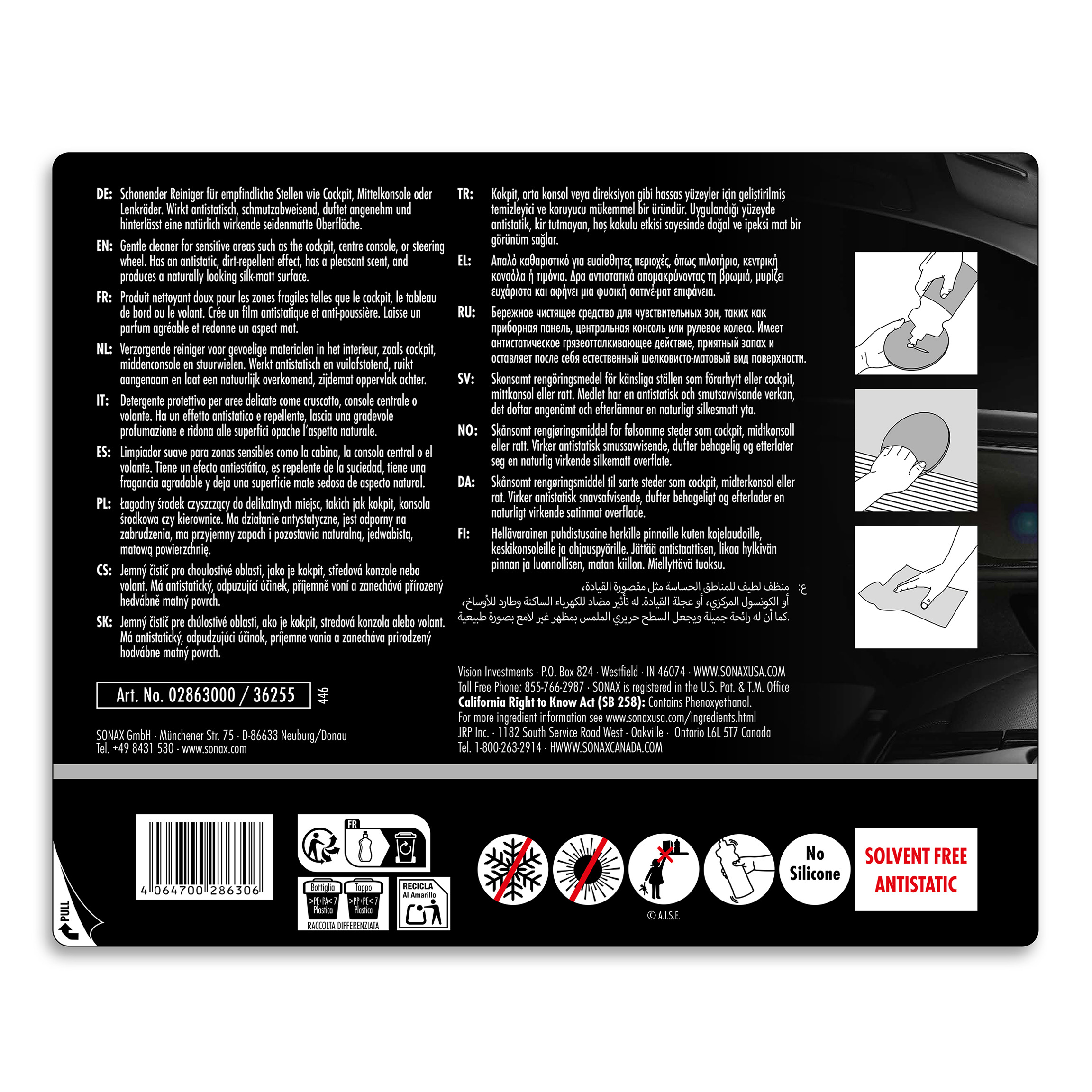 Делікатний засіб SONAX PROFILINE Sensitive Surface Detailer (286300) для чищення таких чутливих ділянок, як кабіна, центральна консоль або рульове колесо. Має антистатичну, брудовідштовхуючу дією, має приємний аромат і залишає природну шовковисто-матову поверхню. Не містить силікону.