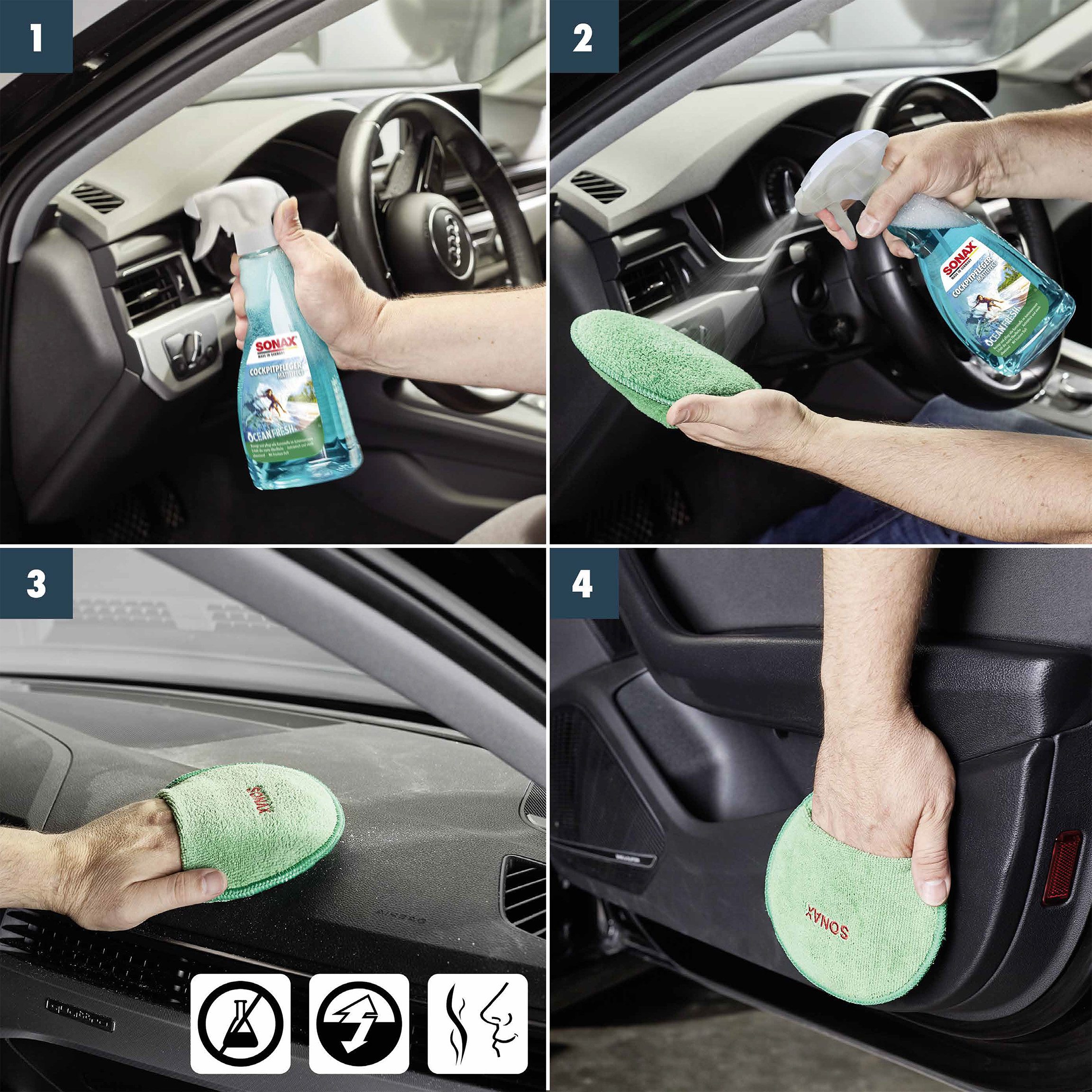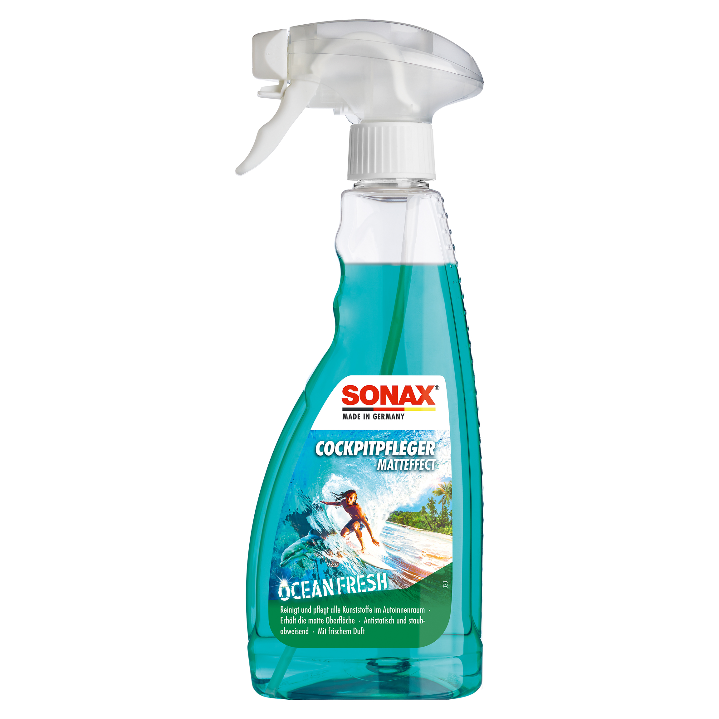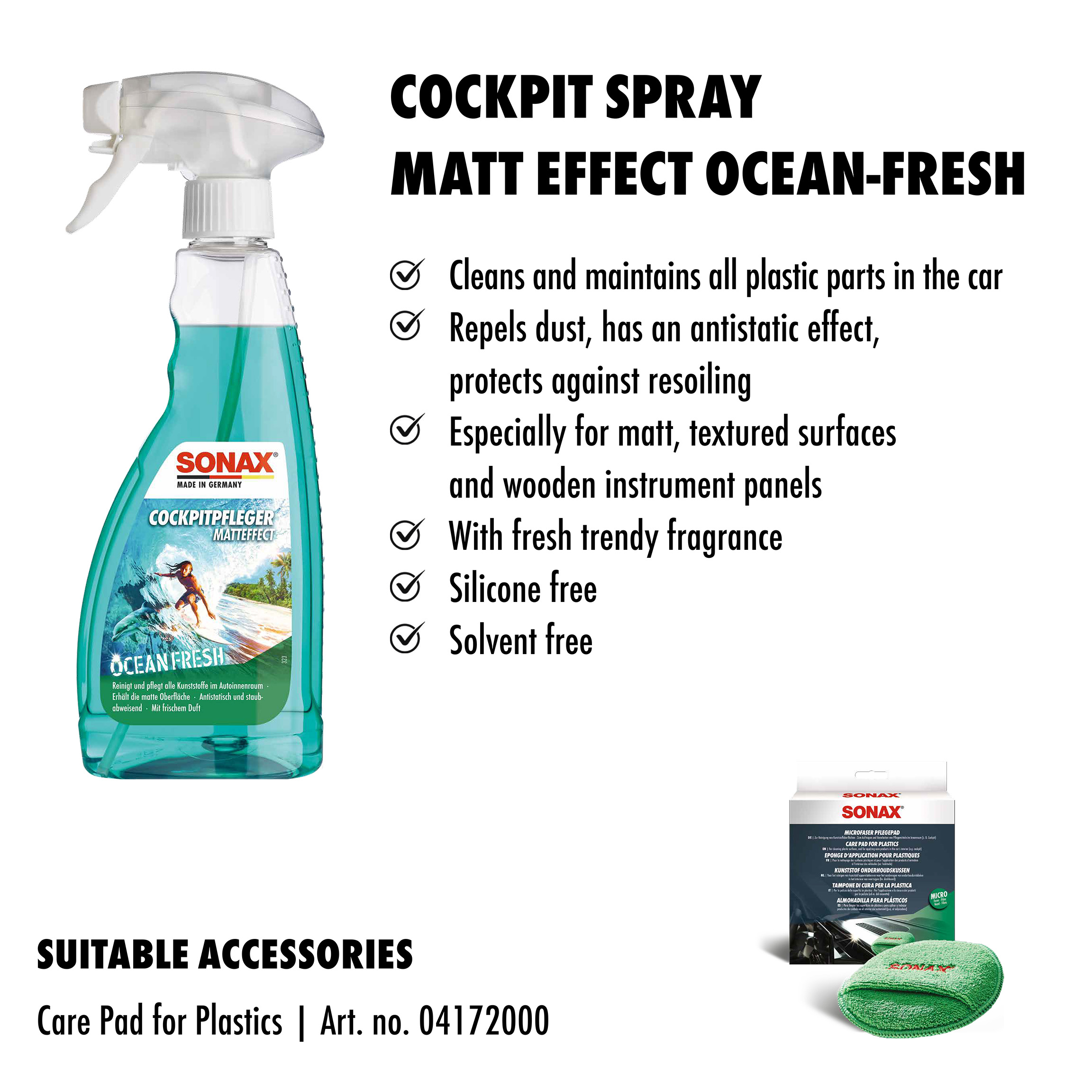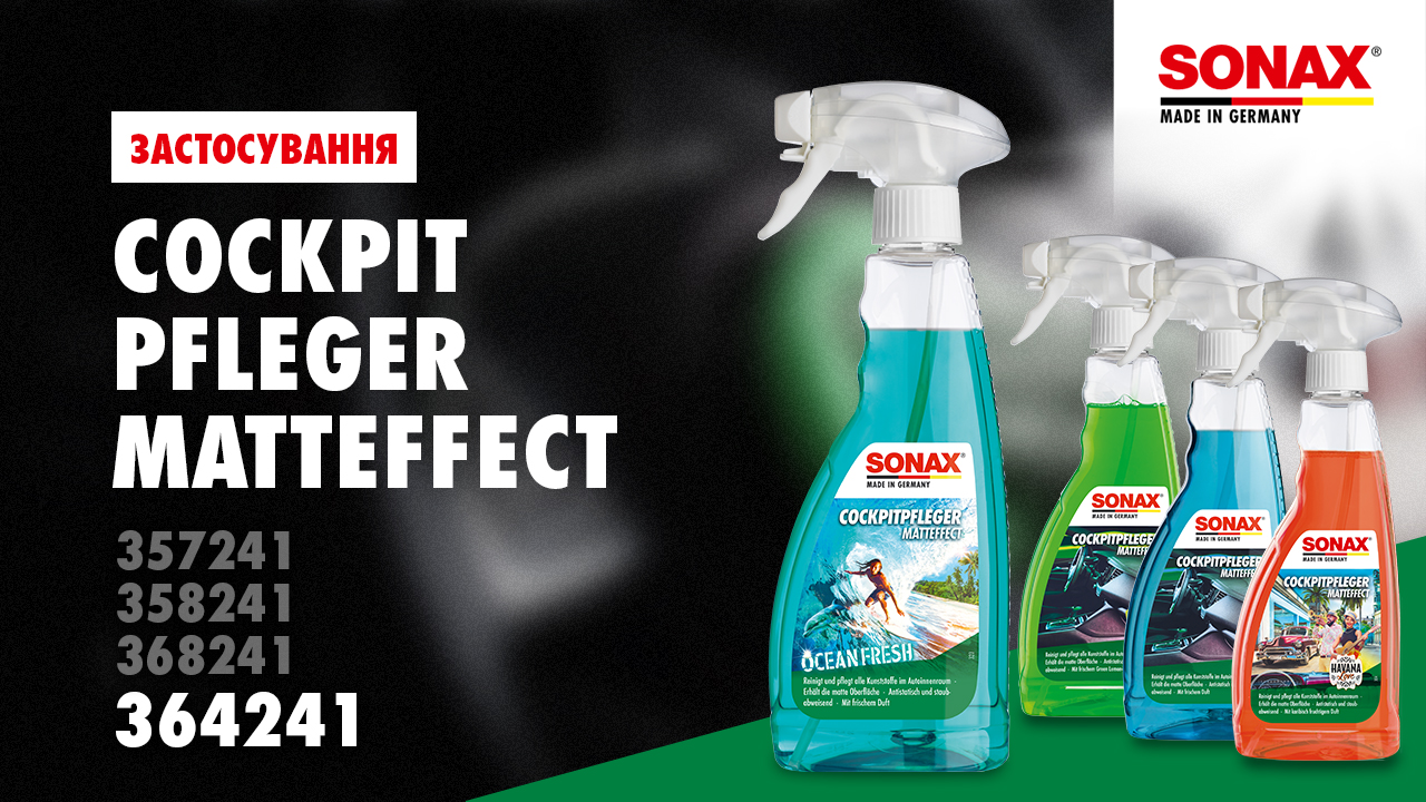 Матовий засіб для догляду за салоном автомобіля SONAX Cockpitpfleger - ocean-fresh (364241) очищає і доглядає за всіма пластиковими деталями автомобіля. Він надає поверхні пилевідштовхуючу, антистатичну властивість і захищає пластик від повторного забруднення. Залишає приємний аромат. SONAX Cockpitpfleger Matteffect особливо підходить для матових, структурованих поверхонь та дерев'яної фурнітури. За допомогою засобу зберігається початковий матовий вид кабіни, завдяки чому ви уникнете дратівливих відблисків панелі приладів на лобовому склі. Не містить силікону та розчинників.