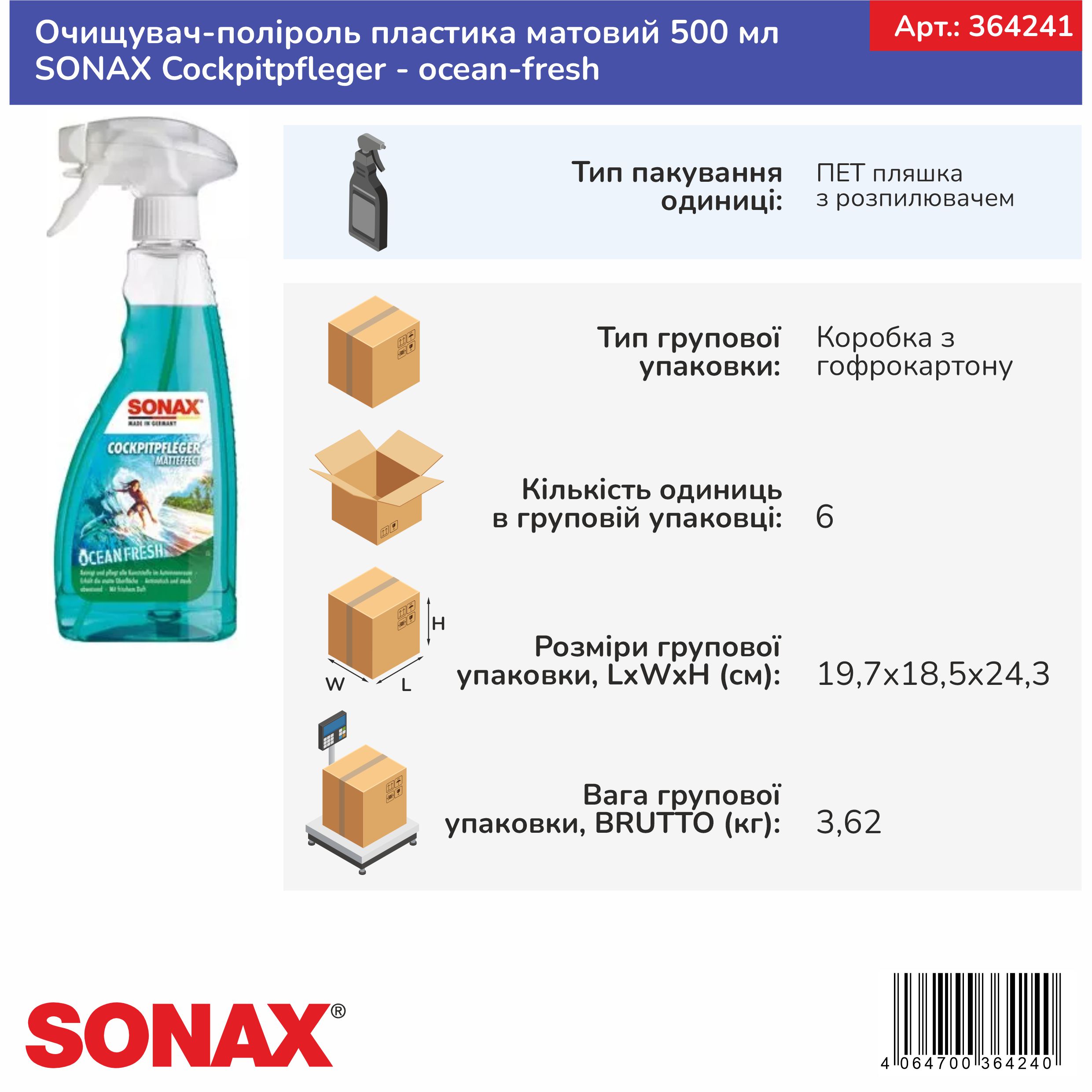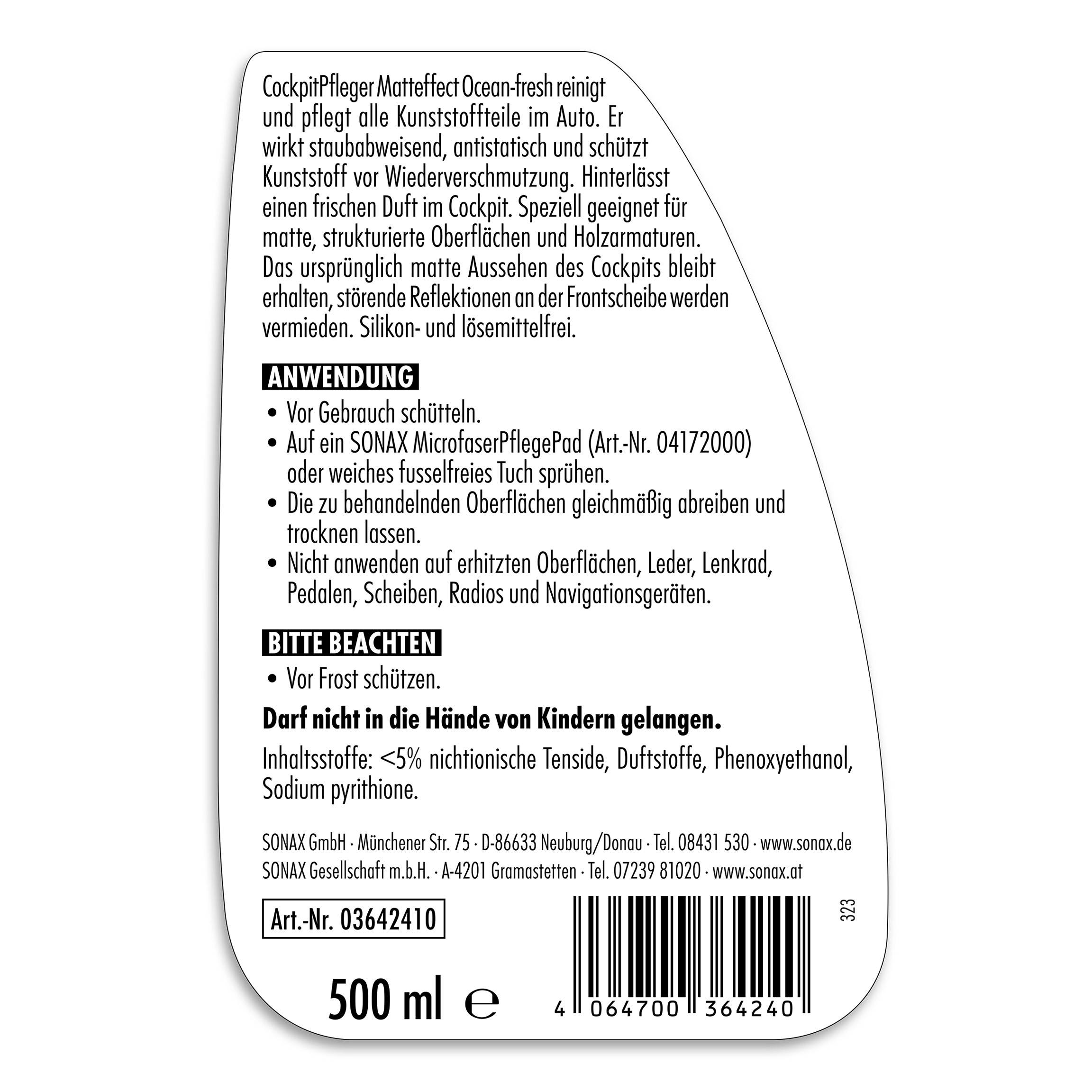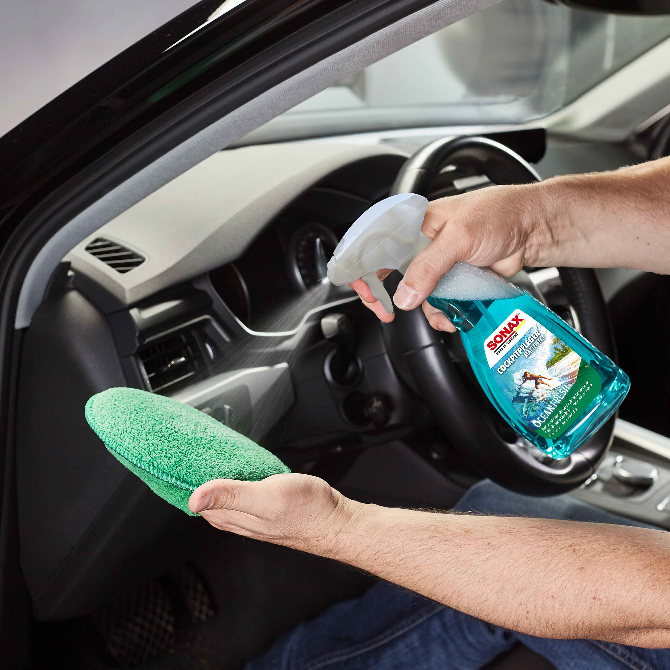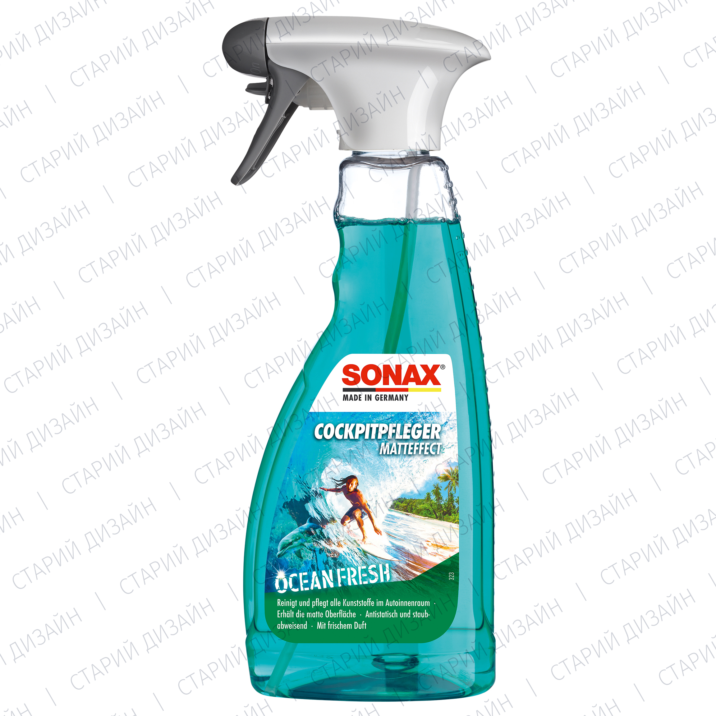 Матовий засіб для догляду за салоном автомобіля SONAX Cockpitpfleger - ocean-fresh (364241) очищає і доглядає за всіма пластиковими деталями автомобіля. Він надає поверхні пилевідштовхуючу, антистатичну властивість і захищає пластик від повторного забруднення. Залишає приємний аромат. SONAX Cockpitpfleger Matteffect особливо підходить для матових, структурованих поверхонь та дерев'яної фурнітури. За допомогою засобу зберігається початковий матовий вид кабіни, завдяки чому ви уникнете дратівливих відблисків панелі приладів на лобовому склі. Не містить силікону та розчинників.