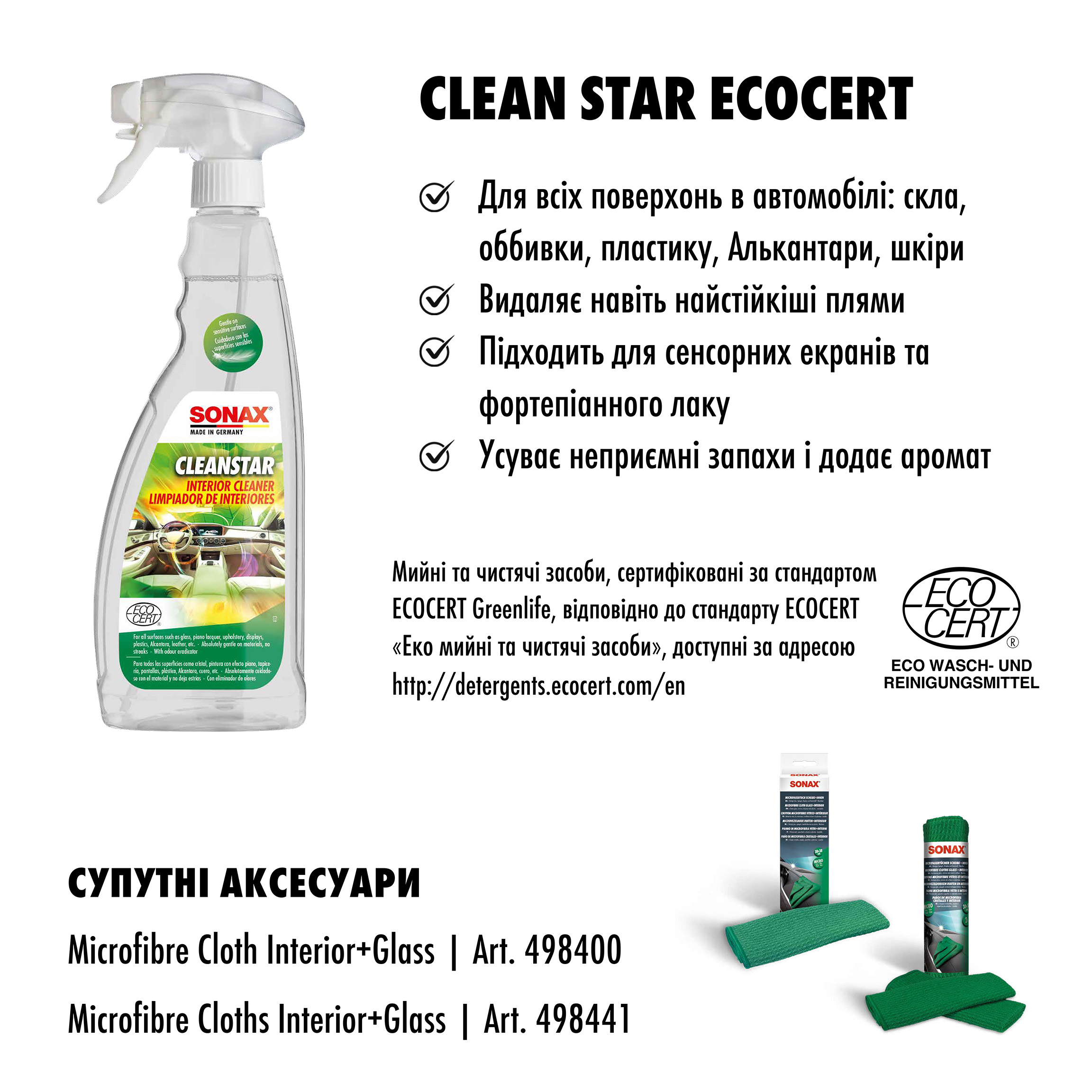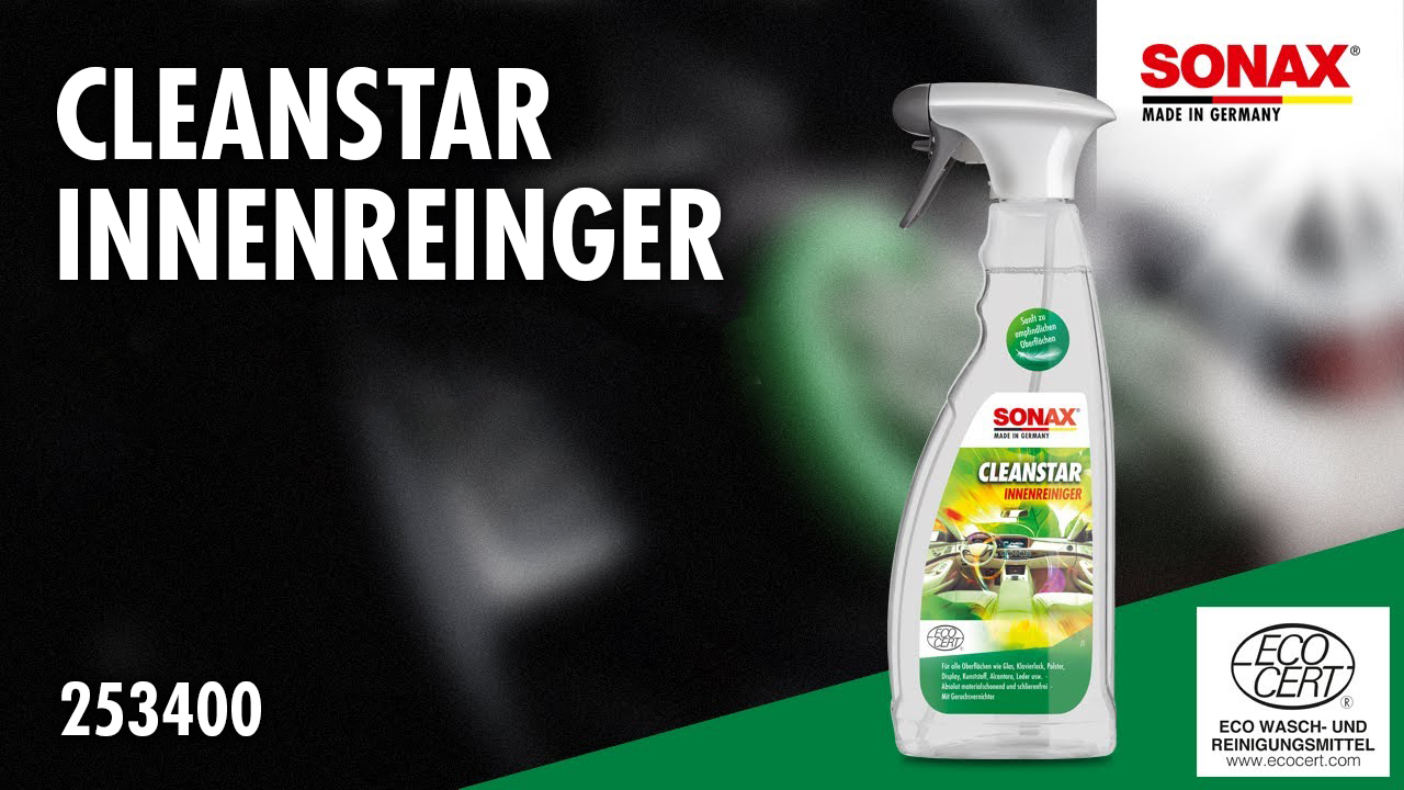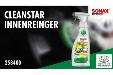 Очисник інтер'єру універсальний із поглиначем запахів 750 мл SONAX Clean Star Ecocert (253400) забезпечує дбайливе чищення всіх поверхонь у салоні автомобіля – стекол, оббивки, пластику, алькантари, шкіри тощо. М'яко видаляє навіть стійкі забруднення та залишає приємний свіжий аромат. Також ідеально підходить для очищення без розводів скляних поверхонь, дзеркал, чутливих сенсорних дисплеїв та рояльного лаку. Засіб містить компоненти, що ефективно усувають різні запахи.