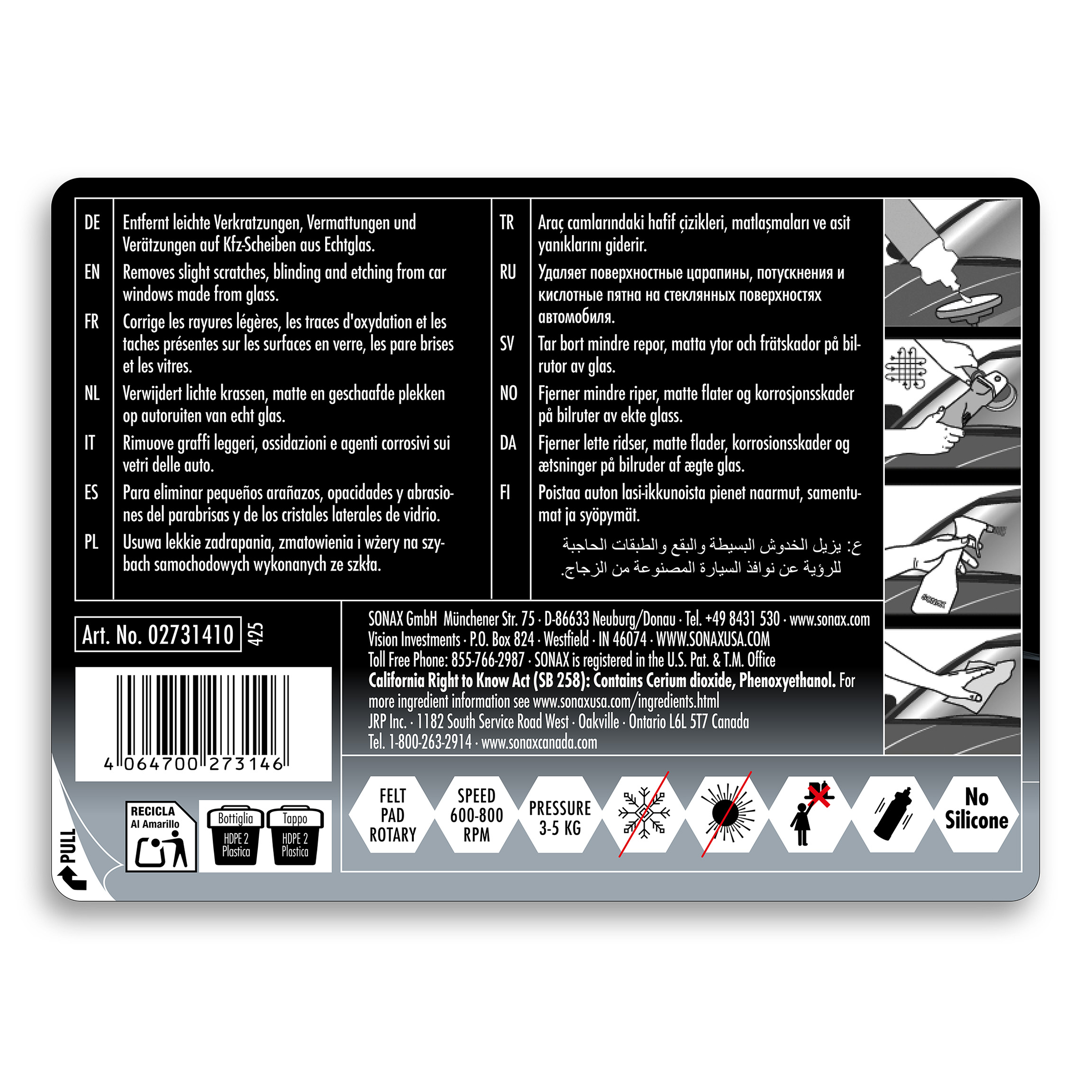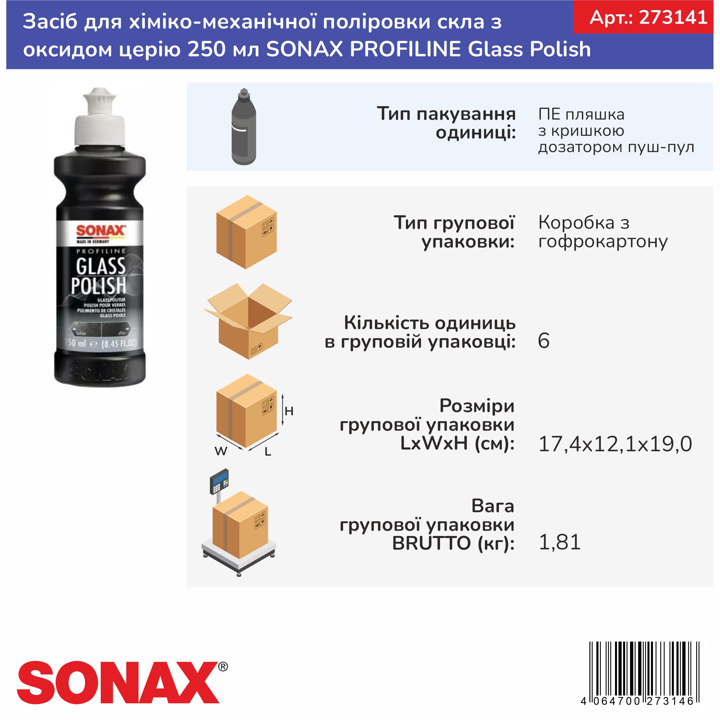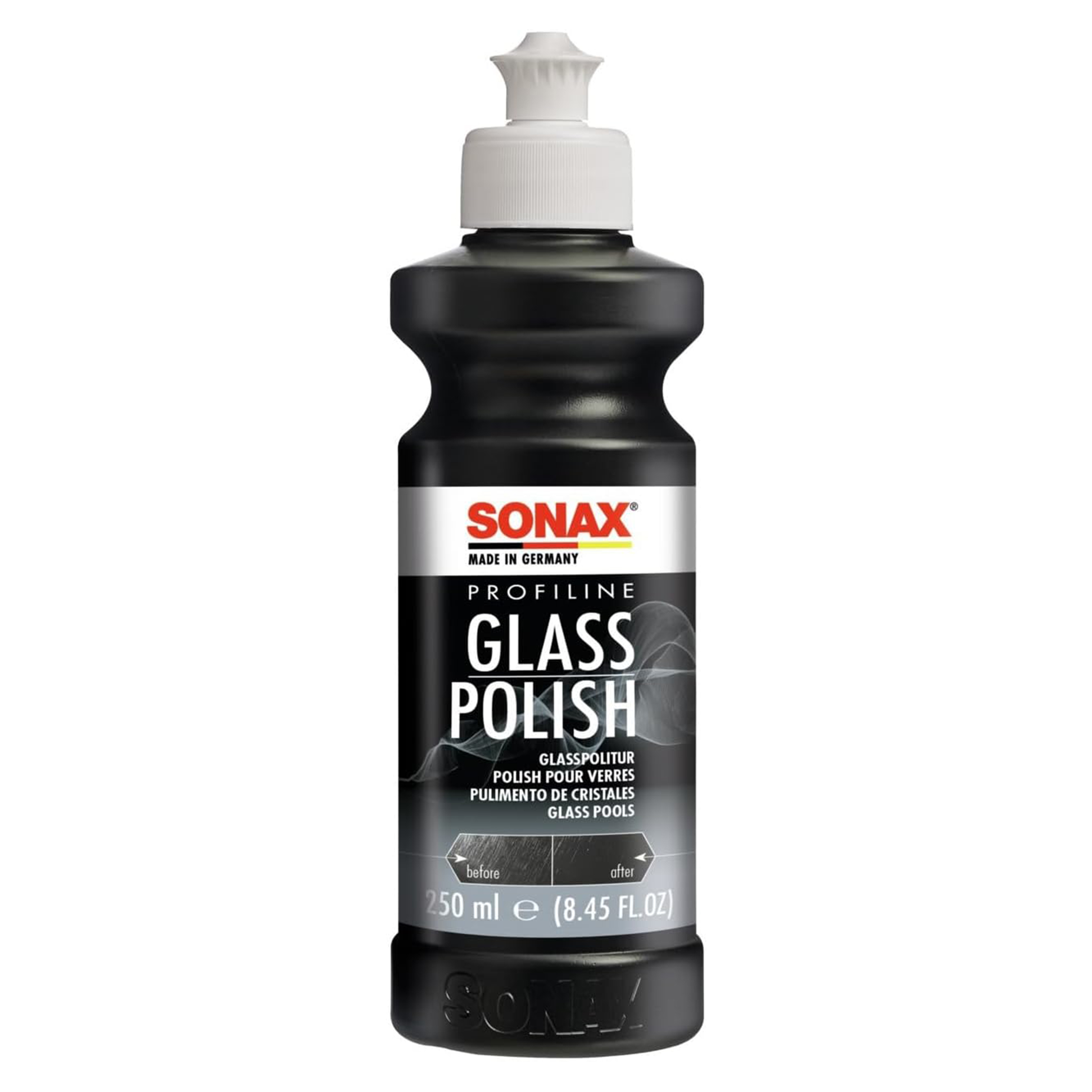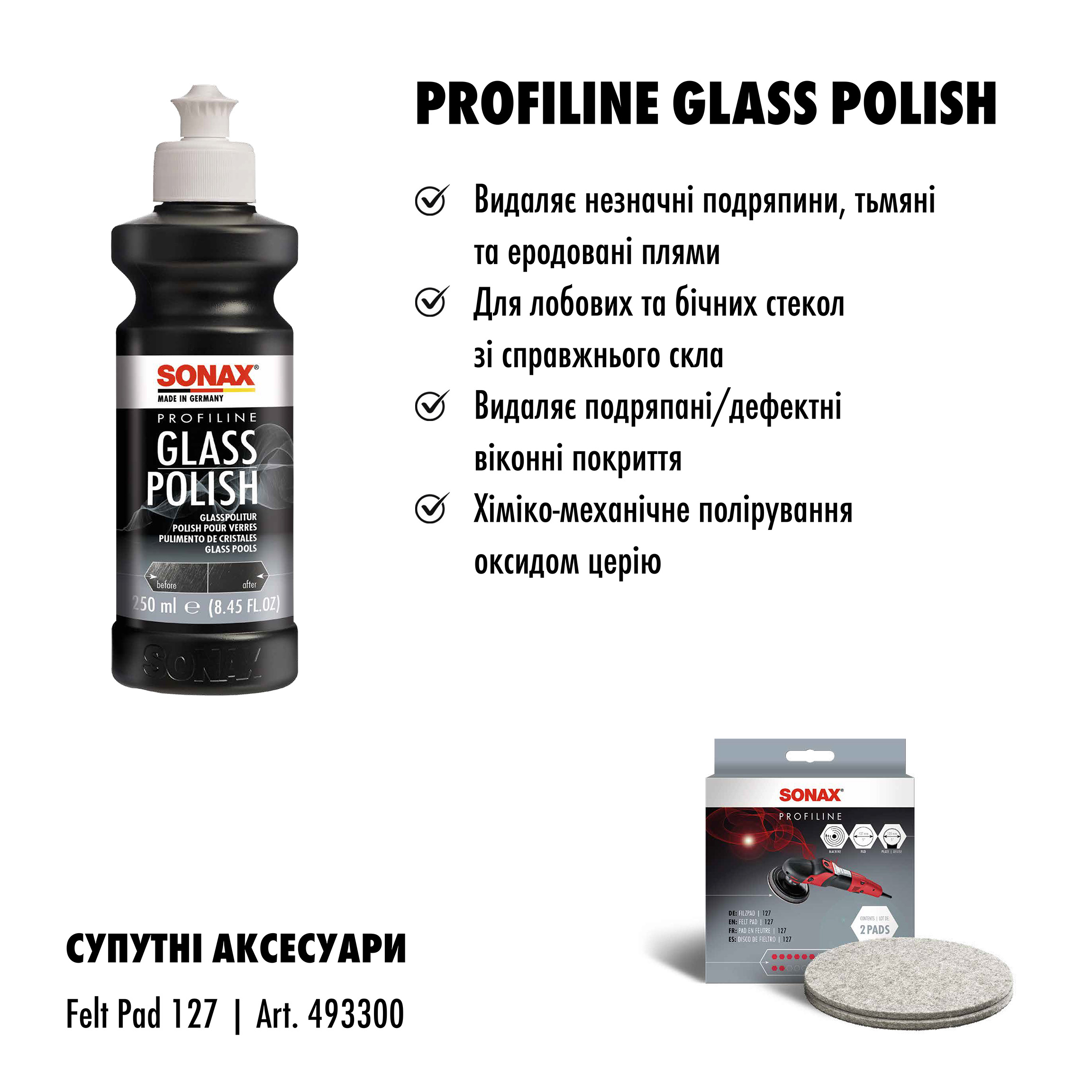 Високоякісний поліроль SONAX PROFILINE Glass Polish (273141), призначений для усунення легких подряпин, матованого скла утвореного абразивними частинками дорожнього пилу, снігу, льоду, бруду з поверхні вітрового, заднього і бічного скла, а також скляної оптики фар. Полірування скла відбувається ротаційною полірувальною машинкою хіміко-механічним способом із засобом на основі оксида церія.
