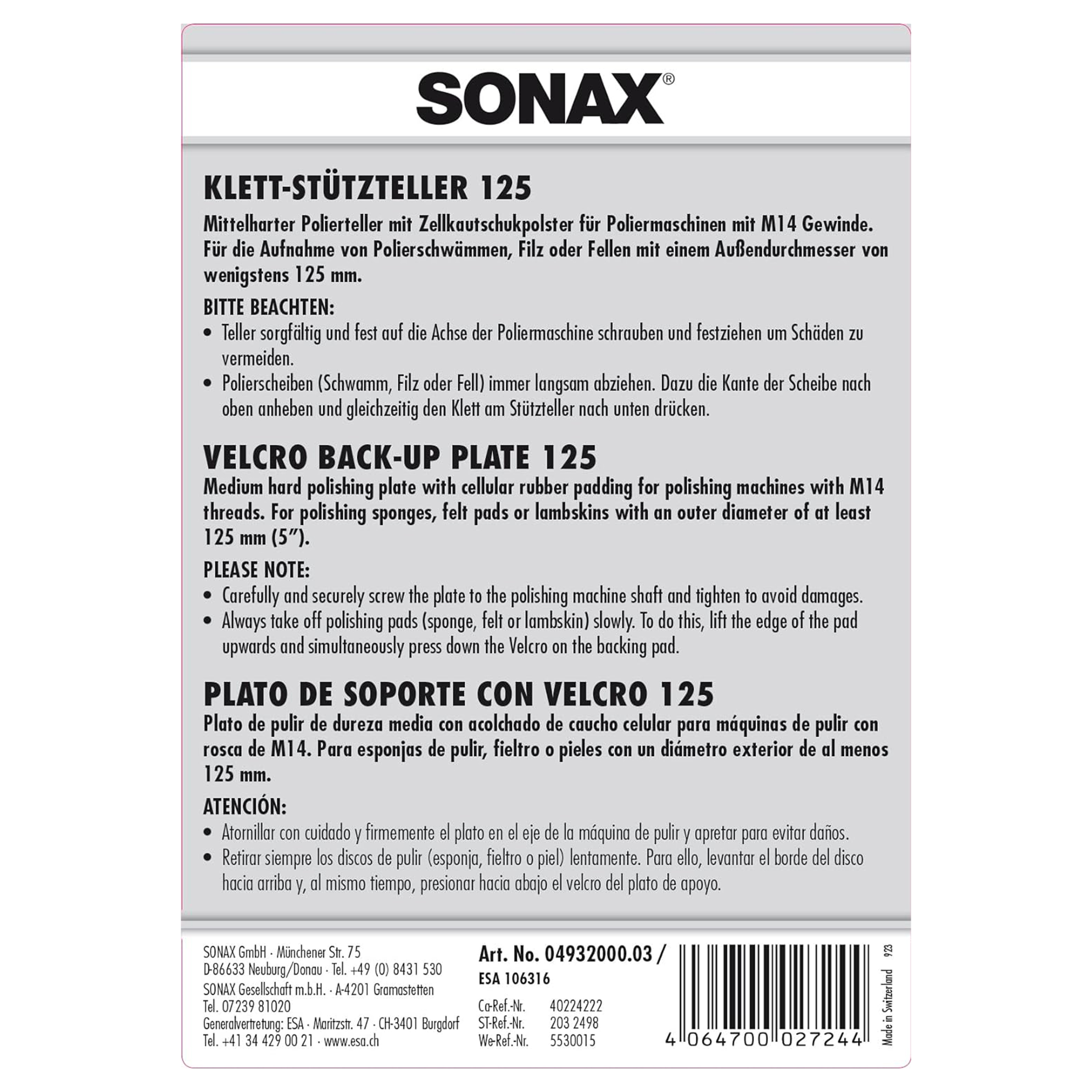 Міцна полірувальна основа для полірувальних машинок з різьбою M14 SONAX Velcro backing pad (493200). Основа-липучка призначена для утримання полірувальних дисків: поролонових, хутряних та повстяних. Діаметр 125 мм.