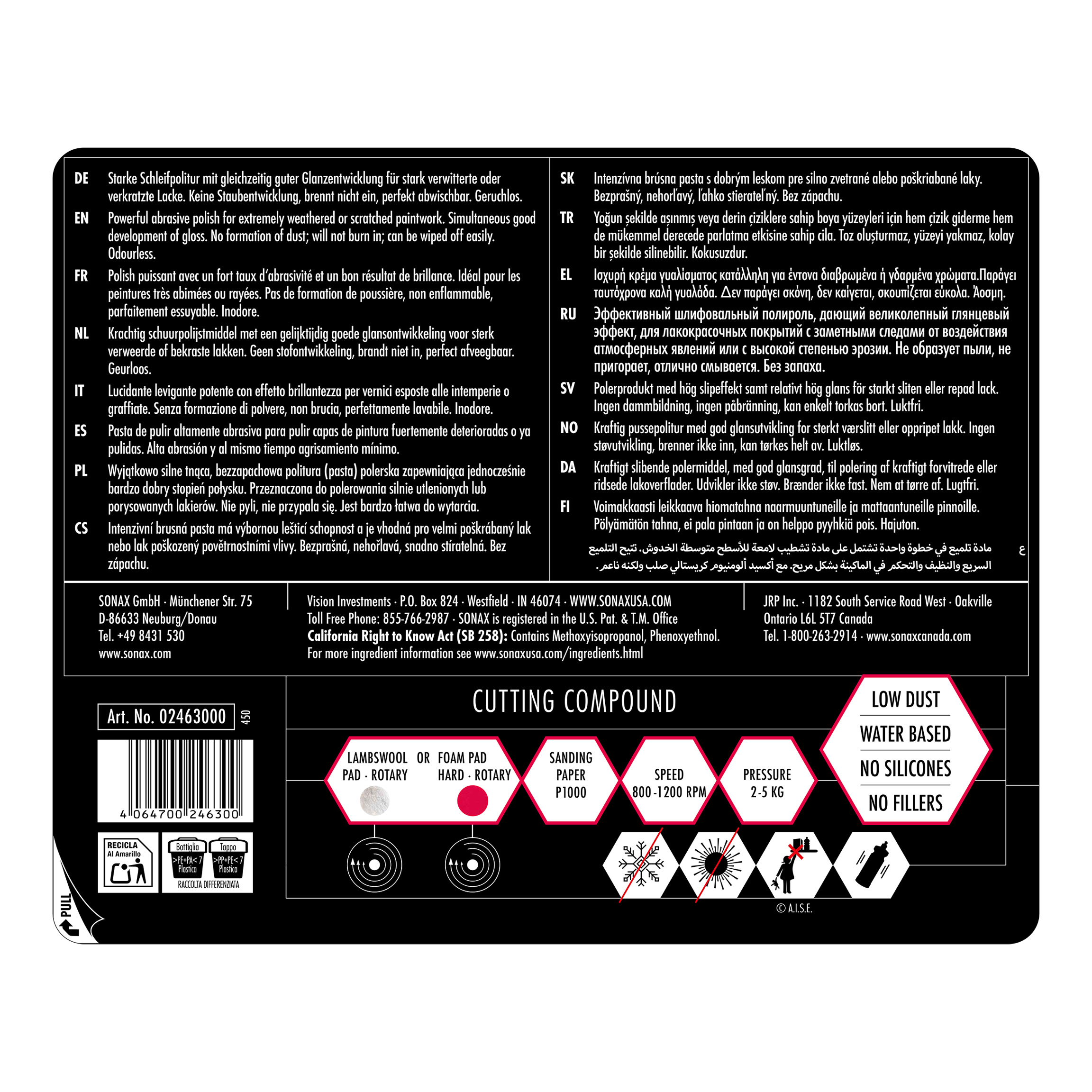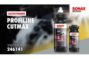 Високоефективна полірувальна паста SONAX PROFILINE CutMax 6-4 (246300) для роторних полірувальних машин. Ідеально підходить для сильно потертих, подряпаних або відшліфованих шарів фарби та лаку. Видаляє подряпини та вкраплення на лакофарбовому покритті, згладжує потертості та видаляє туман фарби. Видаляє сліди шліфування від наждачного паперу P1000 і дрібніші. Паста має низький рівень пилу під час використання завдяки інноваційній технології Low Dust Technology.