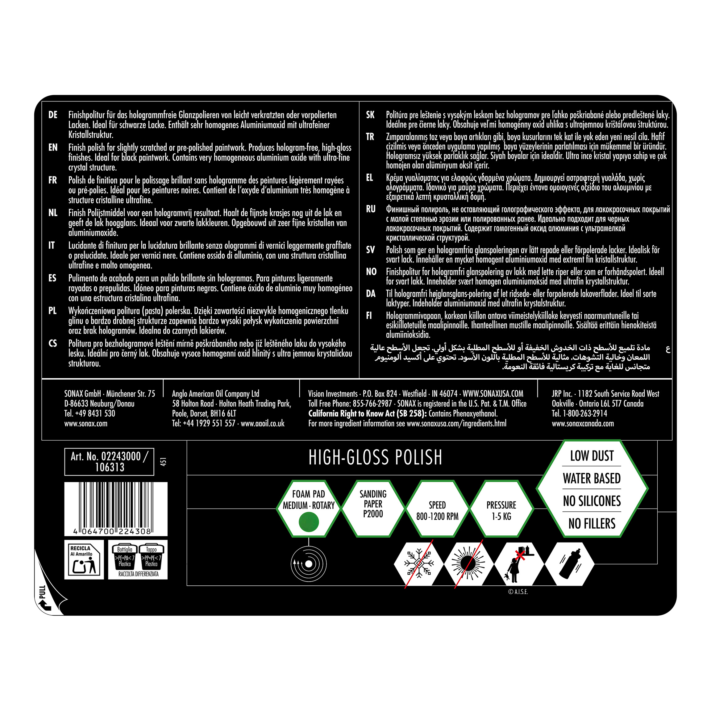 Полірувальна паста для кузова автомобіля SONAX PROFILINE Perfect Finish 4-6 (224300) спеціально розроблена для одноступінчастого полірування локальних дефектів лакофарбового покриття під час фарбування, таких як частинки пилу або патьоки лаку. Спеціальні надзвичайно дрібні, але жорсткі абразиви забезпечують якісне видалення подряпин і оптимальний глянець, не створюючи при цьому голограм. Засіб призначений для використання полірувальною машинкою з регулятором обертів. Крім того, ви також можете використовувати ексцентрикову полірувальну машинку, для фінішної обробки. Видаляє шліфовку до P2000 зернистості. Не містить силікону.