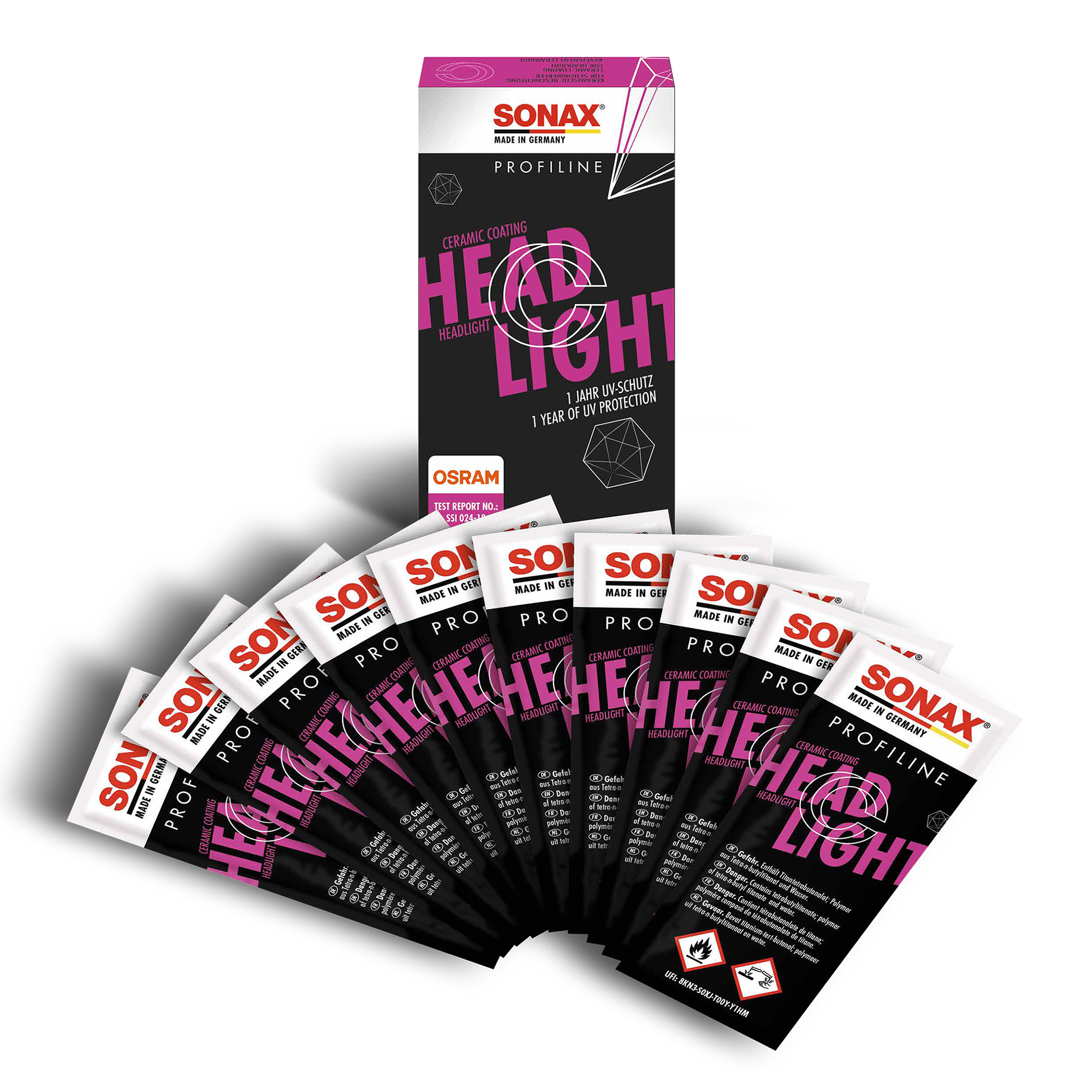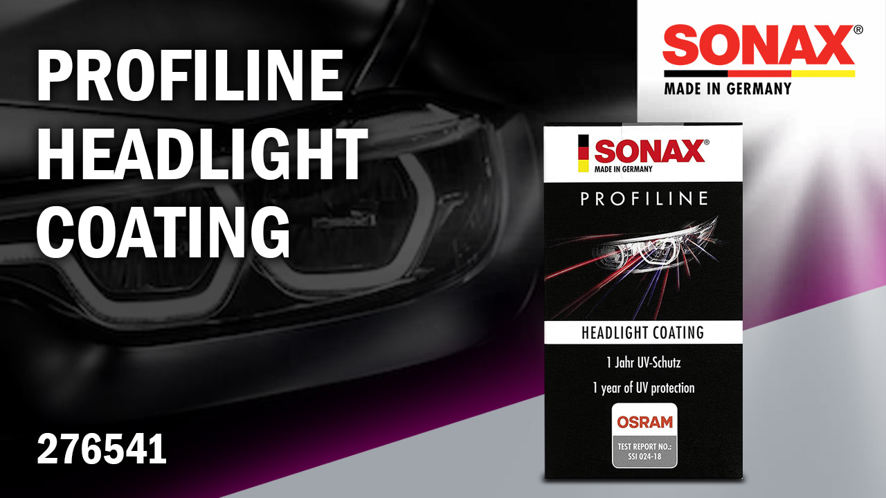 Керамічне довгострокове захисне покриття для пластикових фар автомобілів SONAX PROFILINE Headlight Coating UV-filter (276541). За допомогою цоього засобу створюють захисний шар на основі кремнію та вуглецю, який стійкий до впливів навколишнього середовища і засобів очищення автомобілів, а також запобігає вицвітанню фар через УФ-промені і надає фарам відмінні водовідштовхувальні властивості.