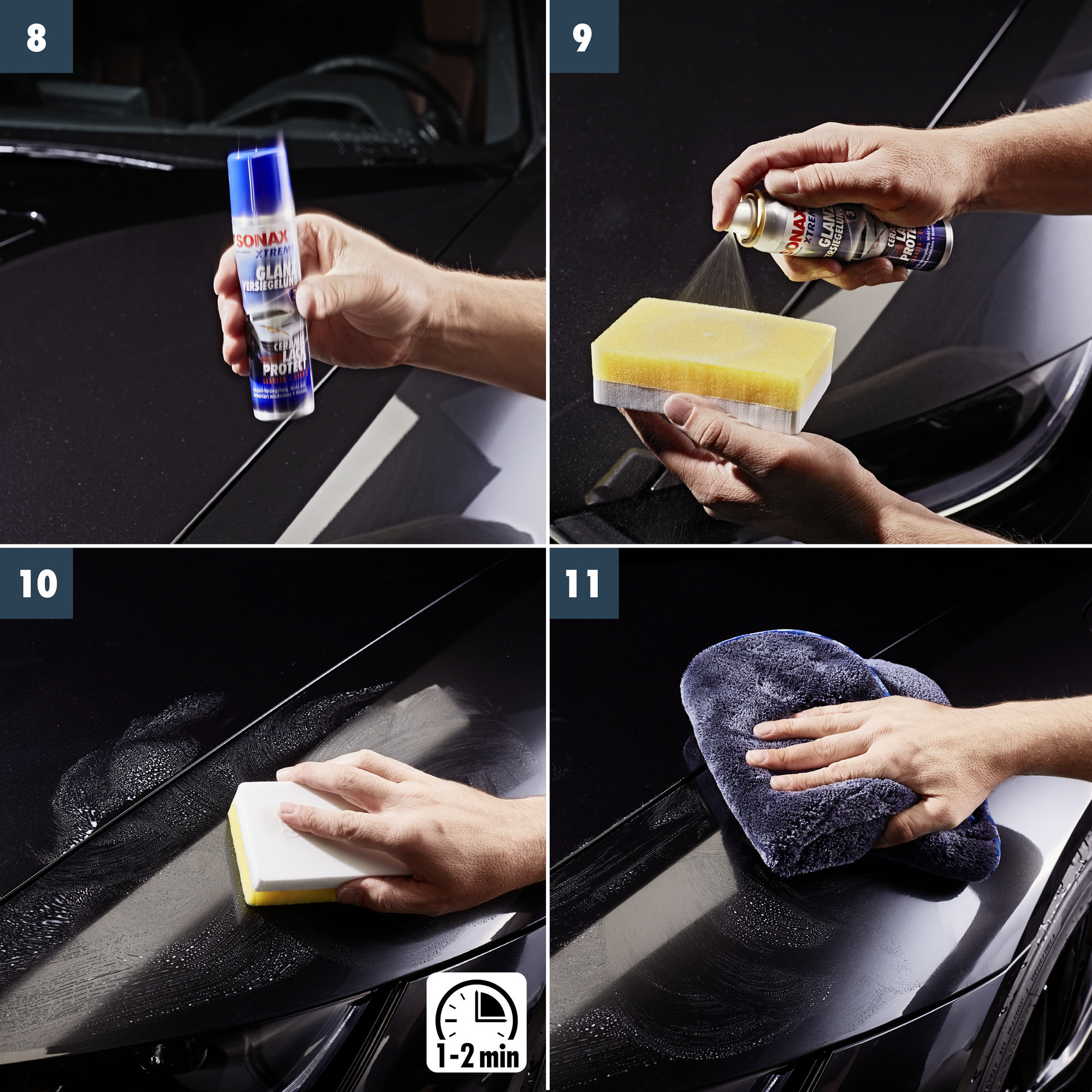 - Нанесіть засіб на суміжні ділянки (макс. ½ капота двигуна) і дайте йому висохнути протягом 1-2 хвилин.