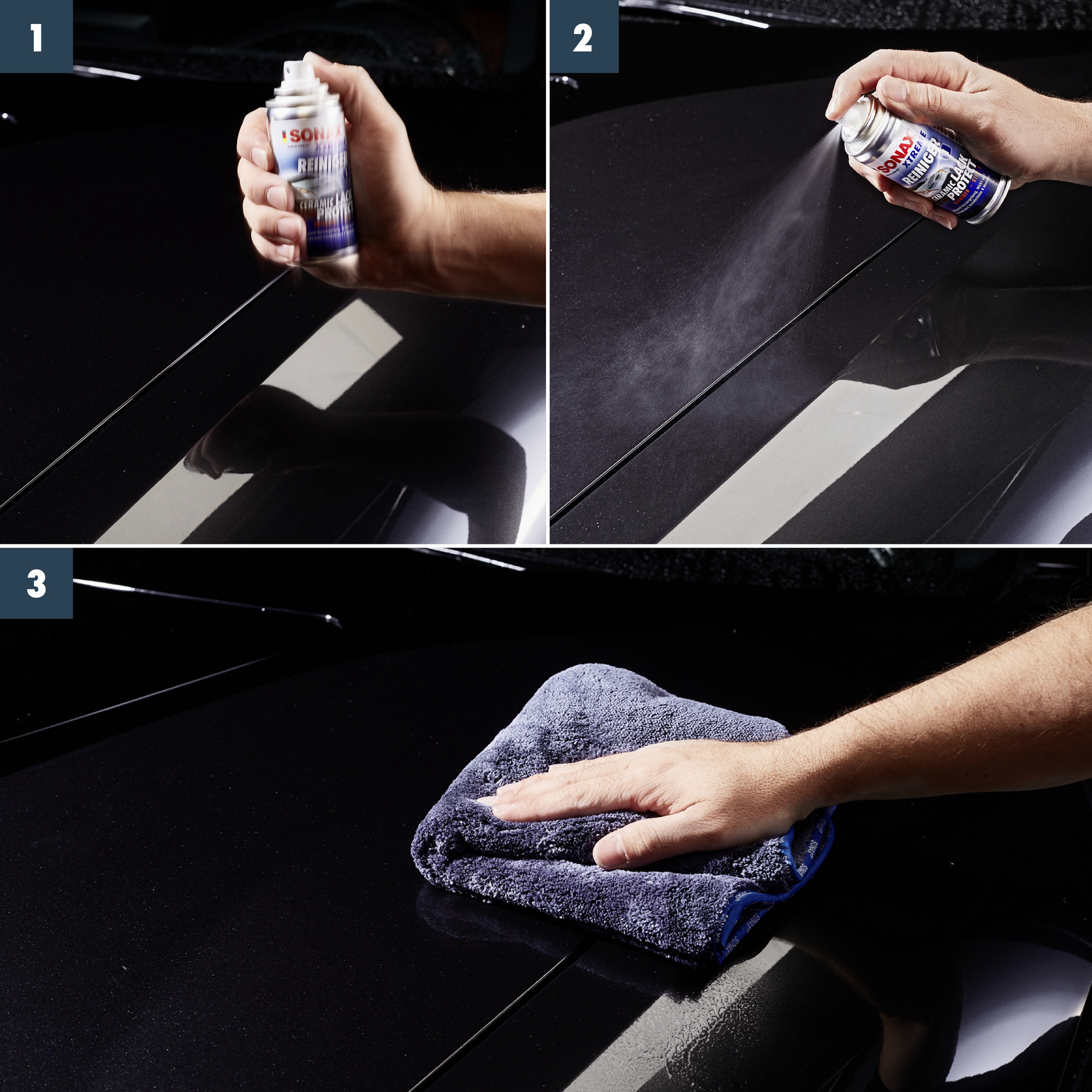 - Залишки смоли видаліть за допомогою синьої глини SONAX. За необхідності відполіруйте фарбовані поверхні до дзеркального блиску.