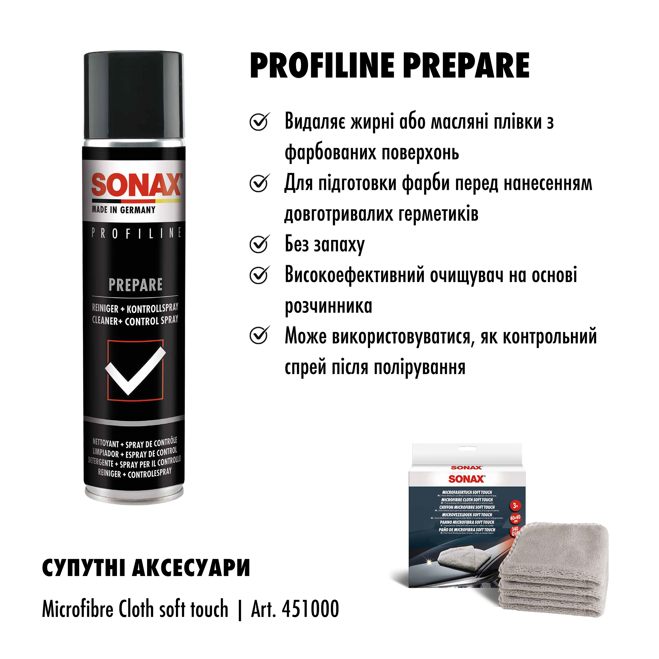 Спеціальна суміш з розчинників SONAX PROFILINE Prepare (237300) призначена для швидкого і ефективного видалення жирових і масляних плівок з пофарбованих поверхонь. Використовується для підготовки лакофарбового покриття перед нанесенням довготривалого захисного нанопокриття серії SONAX PROFILINE Ceramic Coating CC36 (236941) або SONAX PROFILINE Ceramic Coating CC Evo (237941). Ідеально підходить для перевірки результату полірування, а також для знежирення при підготовці ЛФП до фарбування.