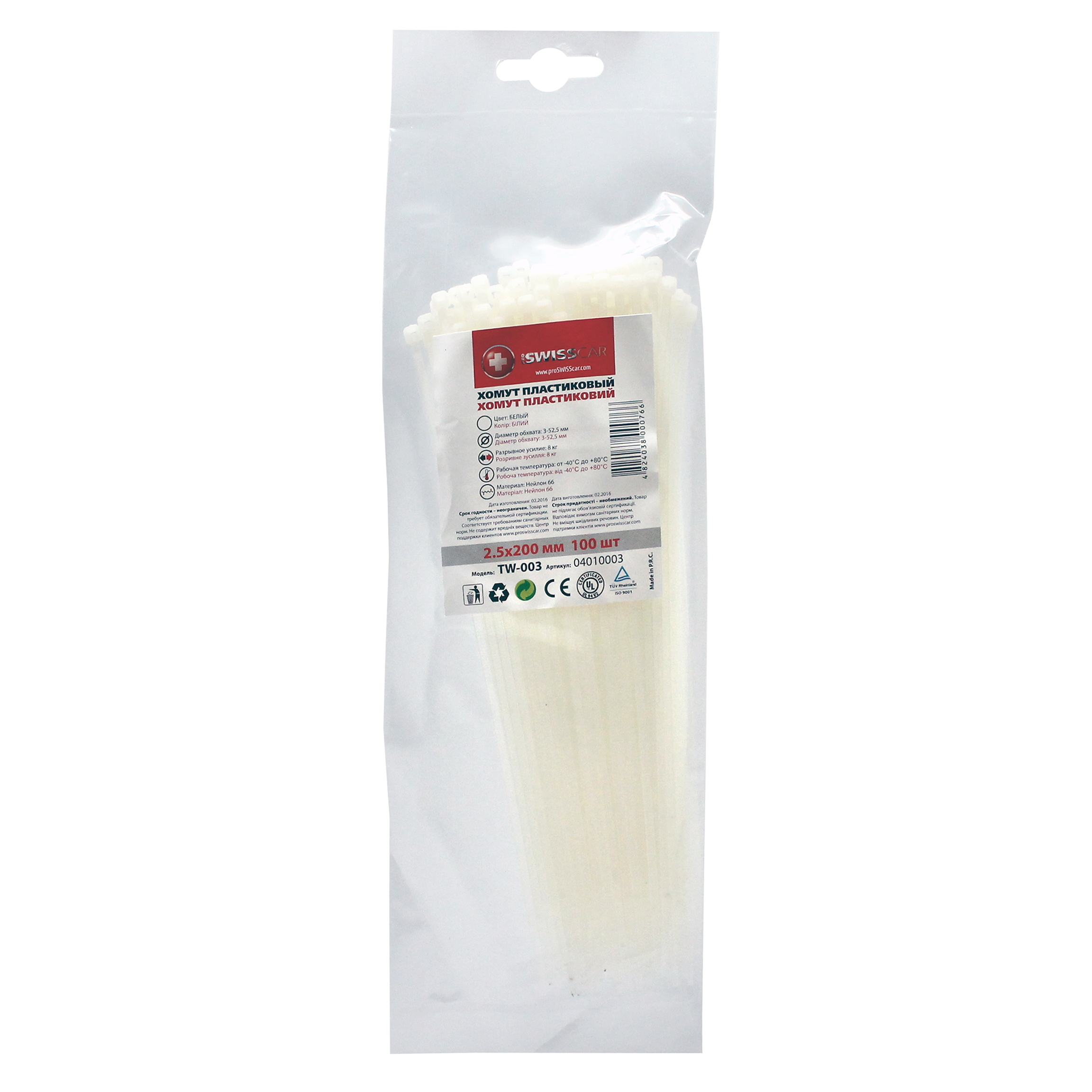 Хомут пластиковий 2,5х000 мм 100 шт білий TW-003 PROSWISSCAR (000766) — виготовлений із міцного матеріалу Nylon-66 (різновид поліаміду) з високими електроізоляційними характеристиками.
