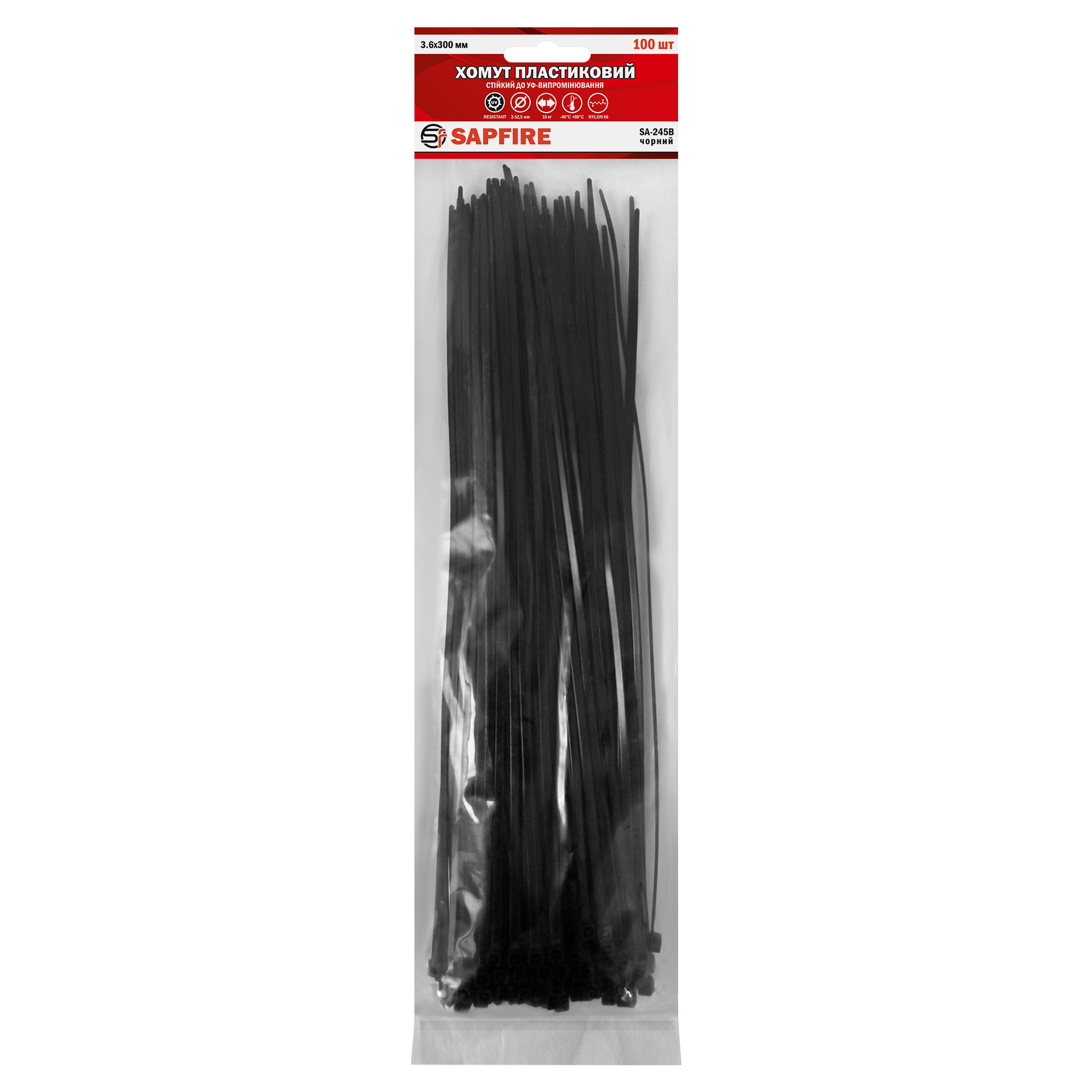 Хомут пластиковий 3,6х300 мм 100 шт чорний SAPFIRE (401042) — виготовлений із міцного матеріалу Nylon-66 (різновид поліаміду) з високими електроізоляційними характеристиками, стійкий до УФ-випромінювання.
