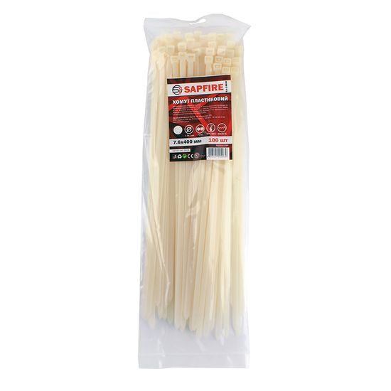 Хомут пластиковий 7,6х400 мм 100 шт білий SAPFIRE (400939) — виготовлений із міцного матеріалу Nylon-66 (різновид поліаміду) з високими електроізоляційними характеристиками.
