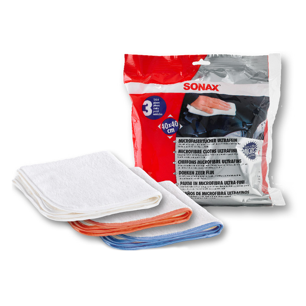 Серветки із ультратонкої мікрофібри для фінішного очищення кузова SONAX Microfiber Cloths Ultrafine (450700) призначені для професійного використання. Для ідеального фінішу всіх робіт на лаку. Суперм'які та добре вбирають. Видаляють м'яко і надійно залишки поліролей та різних консервантів не дряпаючи поверхню. Серветка має заокруглені кути та оброблені кантами різних кольорів. У комплекті 3 серветки розміром 40х40 см.