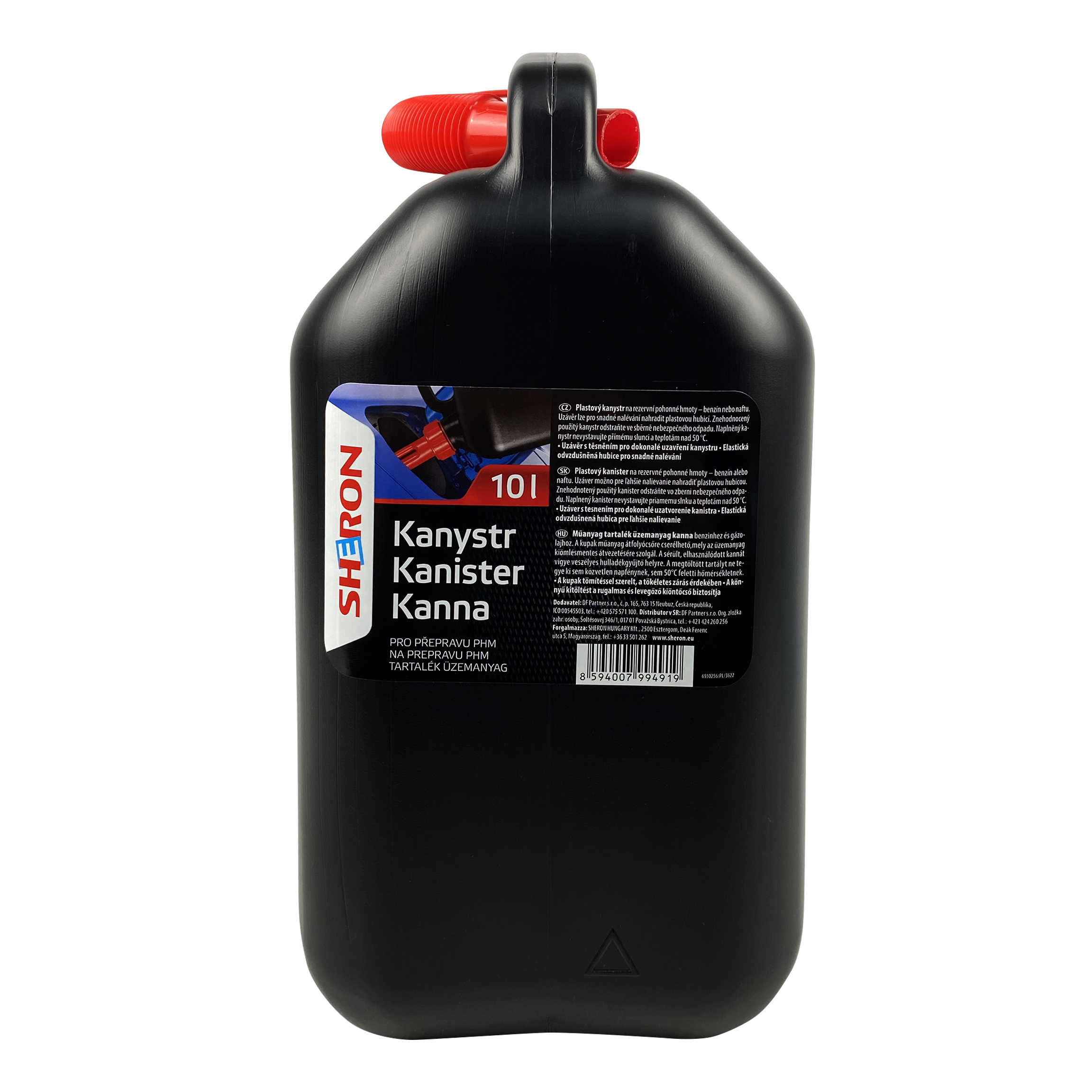 Пластикова каністра 10л SHERON (994919) виготовлена з антистатичного пластику та призначена для зберігання і перевезення бензину, дизельного палива, масел, гасу, розчинників та подібних рідин. Каністра комплектується зручною еластичною гофрованою заливною насадкою для заправки автомобілів, катерів, газонокосарок, мотоблоків тощо. Мають особливу стійку конструкцію. Міцна і не схильна до руйнування і розтріскування.