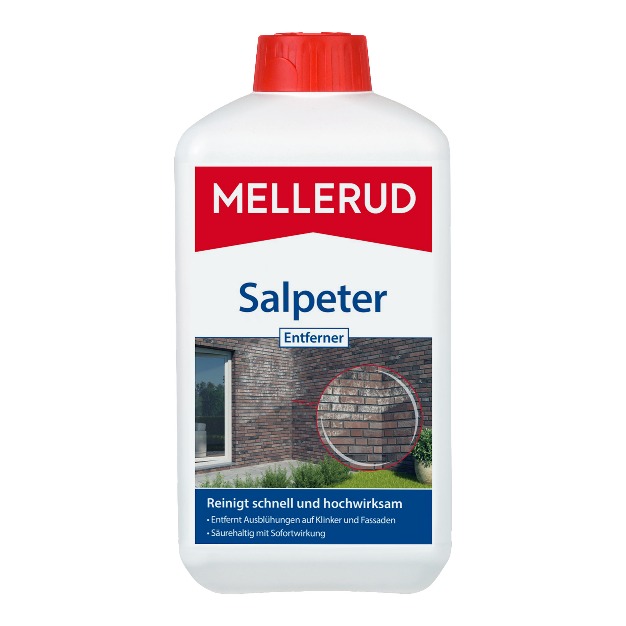 Засіб для видалення висолів та стійких забруднень з цегли, плитки, бетону 1 л MELLERUD Salpeter Entferner (2001000134) швидко і ґрунтовно видаляє висоли, селітру на стінах, настінний грибок та сильні забруднення з клінкеру, цегли, паленої цегли, пористої керамічної плитки та всіх інших кислотостійких поверхонь. Ідеально підходить для фасадів з клінкеру та бетону. Завдяки спеціальній кислотній формулі продукт діє навіть на найстійкіші забруднення та старі залишки. Після видалення забруднень оброблені поверхні слід захистити від проникнення вологи, щоб запобігти повторному забрудненню.