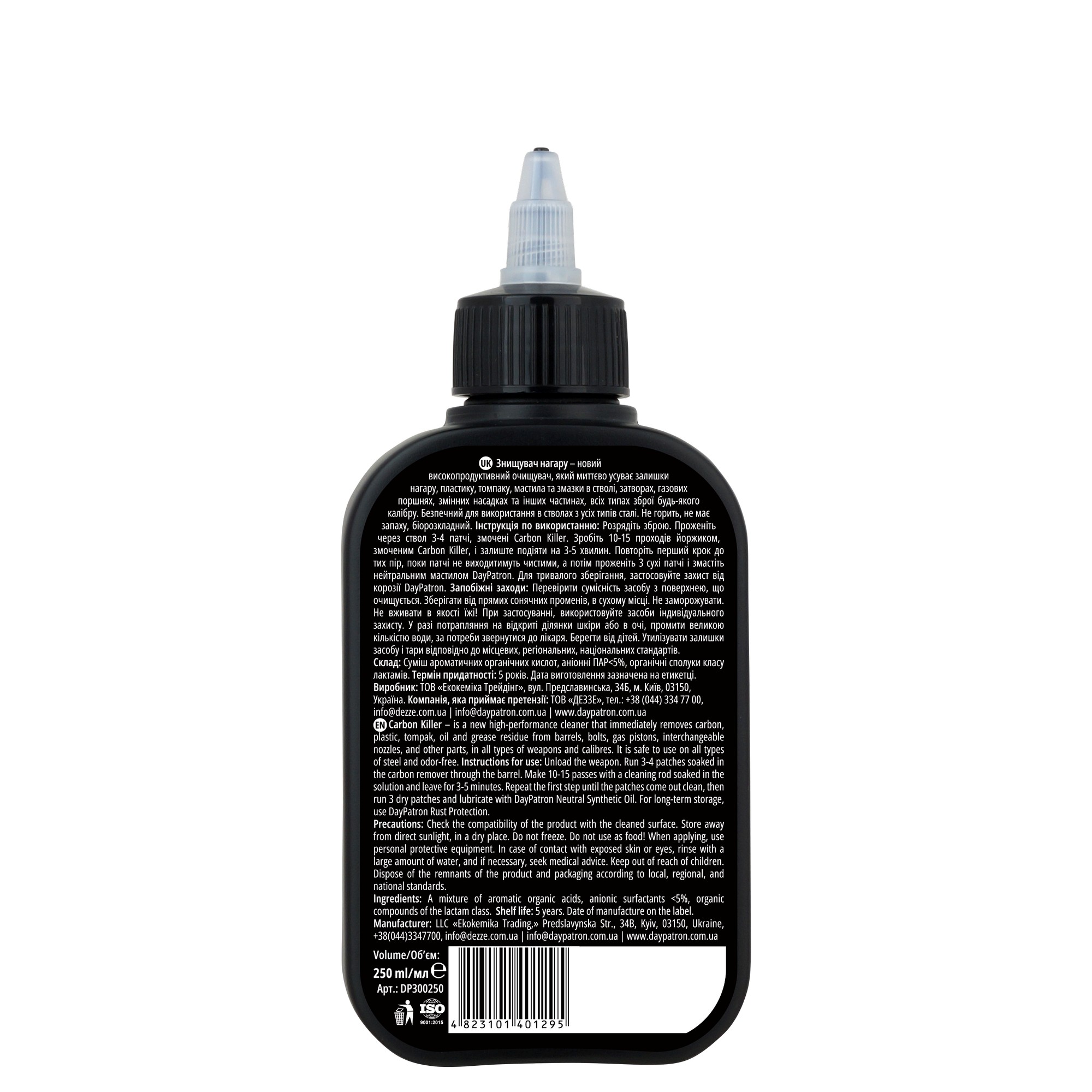 Знищувач нагара DAY PATRON Carbon Killer - це новий стандарт високопродуктивних очищувачів, які миттєво усувають залишки карбонових відкладень, пластику та томпаку, мастила та змазки в стволі, затворах, газових поршнях, змінних насадках і т.д., у всіх видах нарізної та гладкоствольної зброї малого та великого калібру. Безпечний для використання в стволах з нержавіючої сталі та інших типів.
